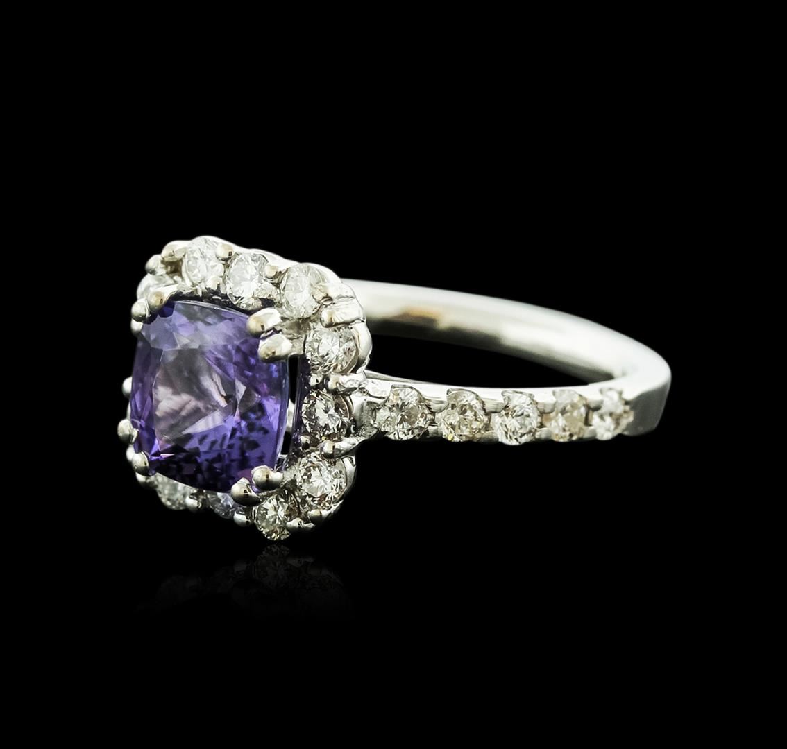 One electronically tested 14KT white gold ladies cast tanzanite and diamond ring with a bright polish finish. Identified with markings of "14K". Condition is new. Containing: One prong set square cushion modified brilliant cut natural tanzanite, measuring 7.90 x 7.90 x 5.14mm, approximate weight of 2.53ct., clarity is eye clean, type I, medium light, very slightly grayish, violet color, (GIA V 4/3), cut is good. Twenty-Two prong set round brilliant cut diamonds, measuring 2.10 - 2.10 x 1.26mm (depth est.) approximate total weight of 22 Stones = 0.75ct. Clarity: SI-2 to I-1. Color: I - J, Cut is Good. Colored gemstones are presumed to have been subjected to commonly used enhancement processes. All diamonds and colored gemstones are graded in the mounting, unless otherwise stated. Total Weight of Colored Stones 2.53ct. Total Weight of Diamonds 0.75ct. Total Weight of Ring 5.60 grams. GGL Appraised at $4,145.00.