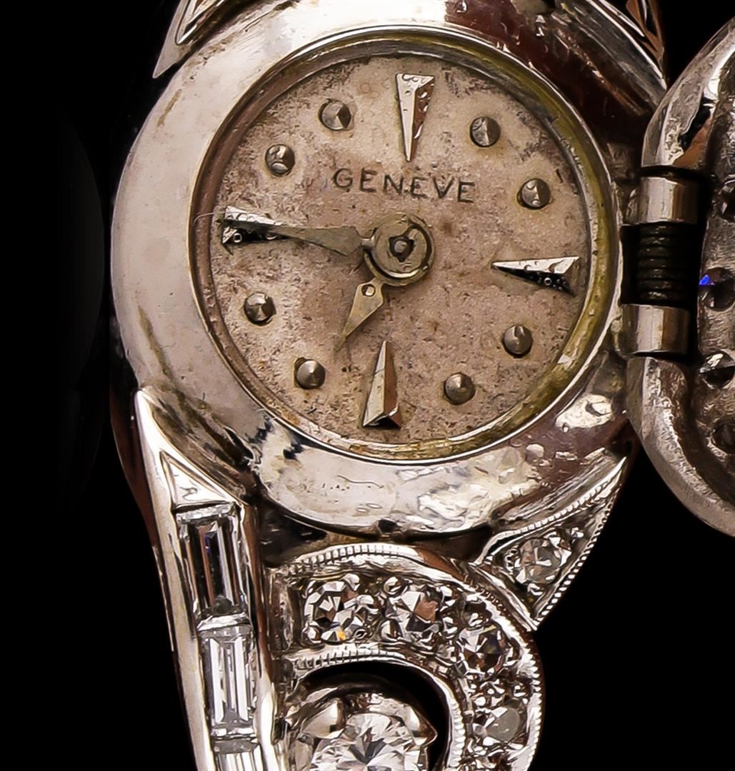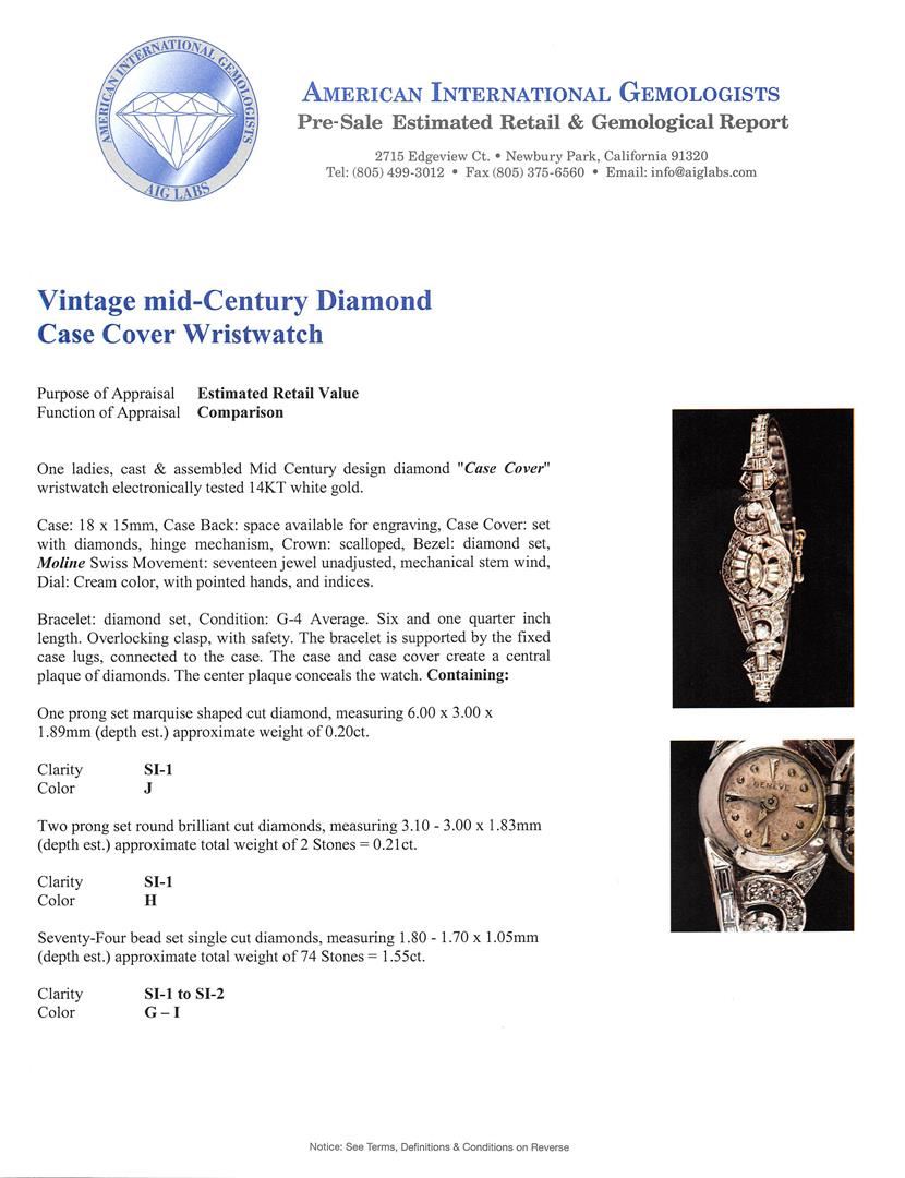One ladies, cast & assembled Mid Century design diamond "Case Cover" wristwatch electronically tested 14KT white gold. Case: 18 x 15mm, Case Back: space available for engraving, Case Cover: set with diamonds, hinge mechanism, Crown: scalloped, Bezel: diamond set, Moline Swiss Movement: seventeen jewel unadjusted, mechanical stem wind, Dial: Cream color, with pointed hands, and indices. Bracelet: diamond set, Condition: G-4 Average. Six and one quarter inch length. Overlocking clasp, with safety. The bracelet is supported by the fixed case lugs, connected to the case. The case and case cover create a central plaque of diamonds. The center plaque conceals the watch. Containing: One prong set marquise shaped cut diamond, measuring 6.00 x 3.00 x 1.89mm (depth est.) approximate weight of 0.20ct. Clarity: SI-1. Color: J Two prong set round brilliant cut diamonds, measuring 3.10 - 3.00 x 1.83mm (depth est.) approximate total weight of 2 Stones = 0.21ct. Clarity: SI-1. Color: H Seventy-Four bead set single cut diamonds, measuring 1.80 - 1.70 x 1.05mm (depth est.) approximate total weight of 74 Stones = 1.55ct. Clarity: SI-1 to SI-2. Color: G - I Fourteen channel set baguette cut diamonds, measuring from 3.00 x 1.40 x 0.98mm (depth est.) to 3.20 x 1.50 x 1.05mm (depth est.) approximate total weight of 14 Stones = 0.58ct. The color grade reflects the entire range of color for this group, Graded in the setting. Clarity: VS-1 to VS-2. Color: G - J. Total Weight of Diamonds 2.54ct. Total Weight of Watch 19.19gm. AIG Appraised at $9,050.00.