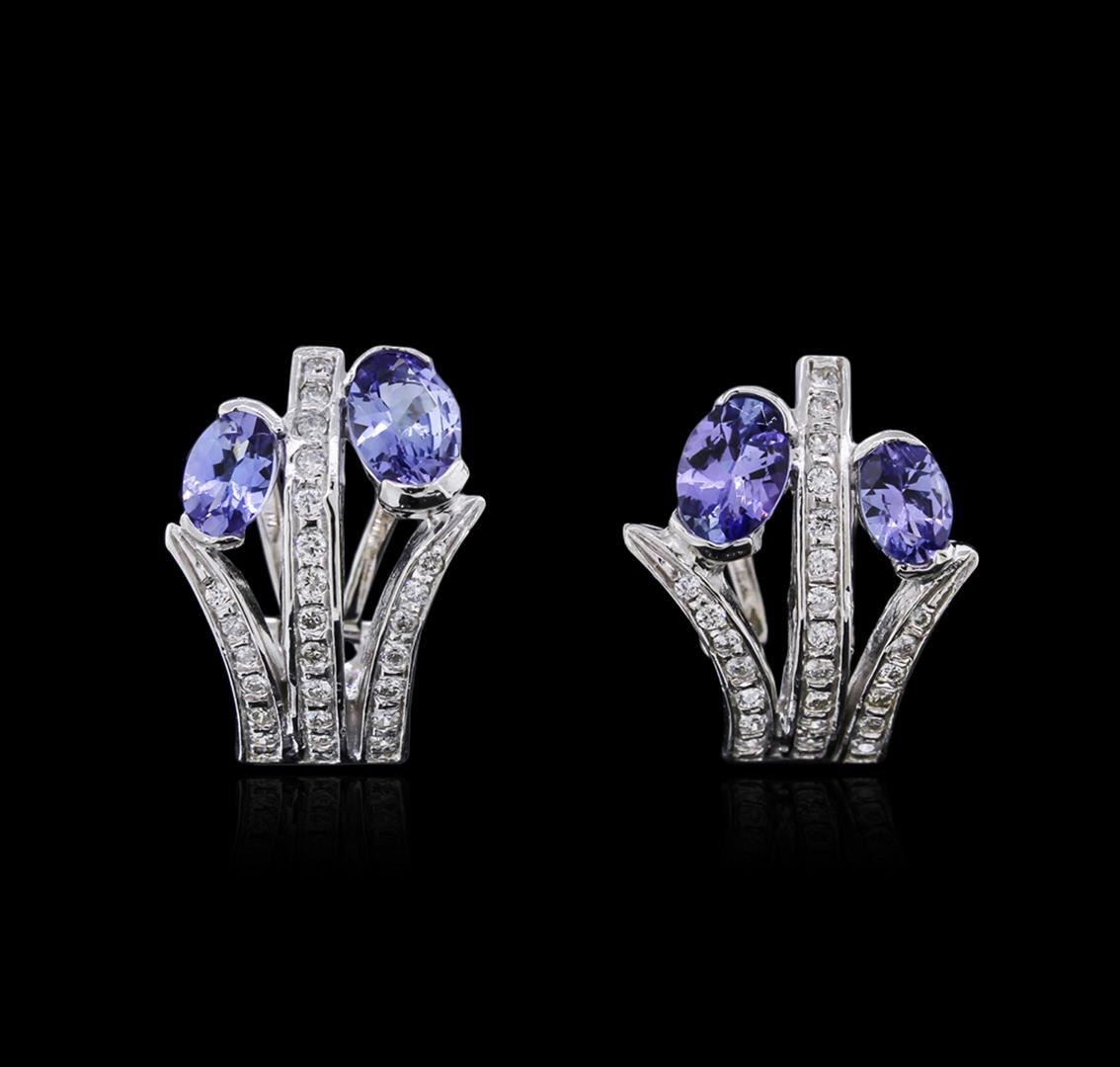 One pair electronically tested 14KT white gold ladies cast tanzanite and diamond earrings with Omega clip backs with a bright polish finish. Identified with markings of "14K". Condition is new. Containing: Four prong set oval modified brilliant cut natural tanzanites, measuring 7.50 x 5.00. x 3.25mm, approximate total weight of 2.54ct., clarity is eye clean, type I, medium light, very slightly grayish, violet color, (GIA V 4/3), cut is good. Fifty-Eight prong set round brilliant cut diamonds, measuring 1.30 - 1.30 x 0.78mm (depth est.) approximate total weight of 58 Stones = 0.62ct. Clarity: SI-1 to SI-2. Color: I - J, Cut is Good. Colored gemstones are presumed to have been subjected to commonly used enhancement processes. All diamonds and colored gemstones are graded in the mounting, unless otherwise stated. Total Weight of Colored Stones 2.54ct. Total Weight of Diamonds 0.62ct. Total Weight of Earrings 9.30 grams. GGL Appraised at $3,935.00.