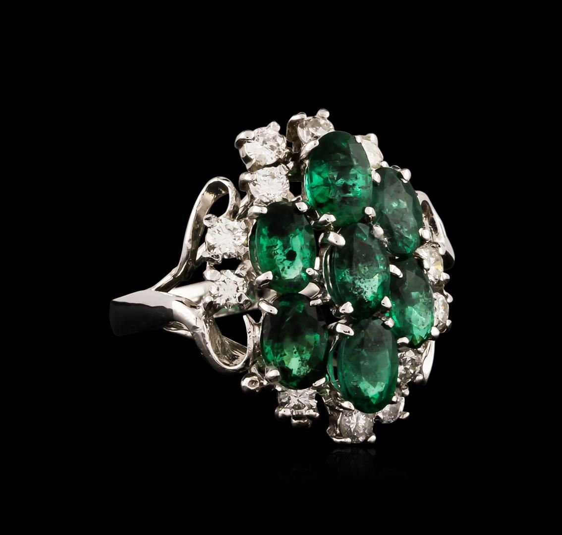 One electronically tested 14KT white gold ladies cast emerald and diamond ring with a bright polish finish. The ring features an organized emerald cluster supported by diamond accents, completed by a two and one-half millimeter wide band. Identified with markings of "14K". Condition is new, good workmanship. Containing: Seven prong set oval mixed cut natural emeralds, measuring 6.00 x 4.00 x 2.60mm, approximate total weight of 2.55ct., clarity is heavily included, type III, medium dark, moderately strong, very slightly bluish green color, (GIA vslbG 6/4), cut is good. Transmitting light with a minimum of distortion, transparent. Naturally occurring internal & external characteristics are present. Measurements &the color grade are an average for the group. Indications of oil residue. Graded in the setting. Twelve prong set round brilliant cut diamonds, measuring 2.50 - 2.40 x 1.47mm (depth est.) approximate total weight of 12 Stones = 0.74ct. Graded in the setting. Clarity: SI-1 to I-1. Color: G - I. Total Weight of Colored Stones 2.55ct. Total Weight of Diamonds 0.74ct. Total Weight of Ring 5.12 grams. AIG Appraised at $4,715.00.