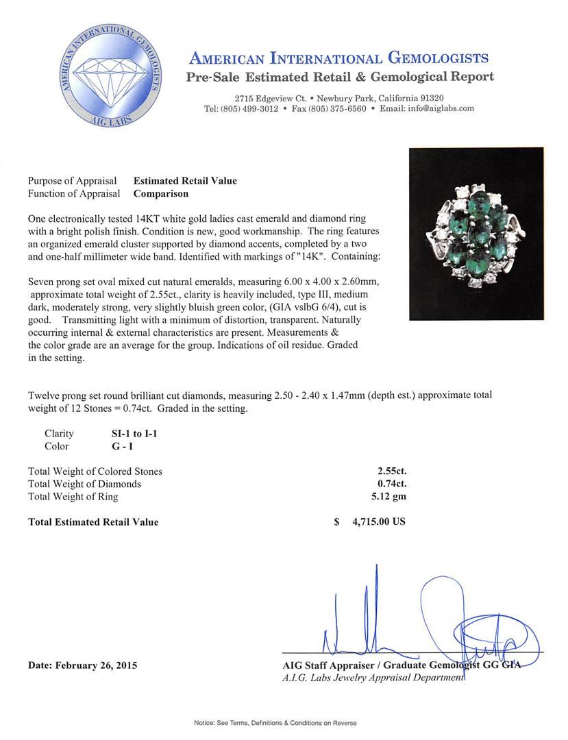 One electronically tested 14KT white gold ladies cast emerald and diamond ring with a bright polish finish. The ring features an organized emerald cluster supported by diamond accents, completed by a two and one-half millimeter wide band. Identified with markings of "14K". Condition is new, good workmanship. Containing: Seven prong set oval mixed cut natural emeralds, measuring 6.00 x 4.00 x 2.60mm, approximate total weight of 2.55ct., clarity is heavily included, type III, medium dark, moderately strong, very slightly bluish green color, (GIA vslbG 6/4), cut is good. Transmitting light with a minimum of distortion, transparent. Naturally occurring internal & external characteristics are present. Measurements &the color grade are an average for the group. Indications of oil residue. Graded in the setting. Twelve prong set round brilliant cut diamonds, measuring 2.50 - 2.40 x 1.47mm (depth est.) approximate total weight of 12 Stones = 0.74ct. Graded in the setting. Clarity: SI-1 to I-1. Color: G - I. Total Weight of Colored Stones 2.55ct. Total Weight of Diamonds 0.74ct. Total Weight of Ring 5.12 grams. AIG Appraised at $4,715.00.