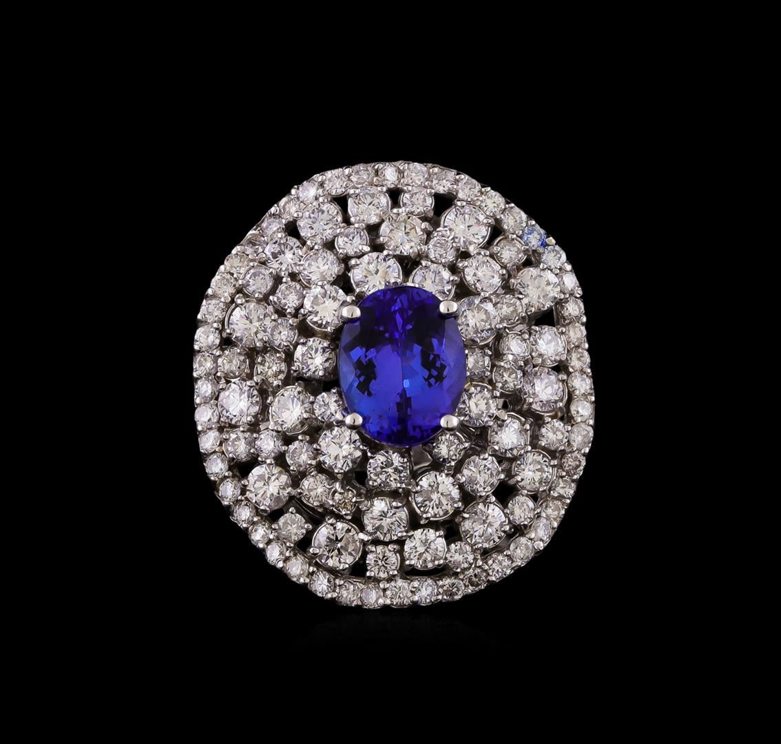 One electronically tested 14KT white gold ladies combination cast & assembled tanzanite and diamond ring with a split shank with a bright polish finish. Identified with markings of "K14". Condition is new. Containing: One prong set oval modified brilliant cut natural tanzanite, measuring 9.68 x 7.72 x 5.02mm, approximate weight of 2.55ct., clarity is eye clean, type I, medium, moderately strong, violet color, (GIA V 5/4), cut is good. Fourteen prong set round brilliant cut diamonds, measuring 2.50 - 1.80 x 1.29mm (depth est.) approximate total weight of 14 Stones = 0.51ct. Clarity: SI-1 to I-1. Color: I - J, Cut is Good. Forty-Eight prong set round brilliant cut diamonds, measuring 1.30 - 1.30 x 0.78mm (depth est.) approximate total weight of 48 Stones = 0.38ct. Clarity: SI-2 to I-1. Color: I - J, Cut is Good. Colored gemstones are presumed to have been subjected to commonly used enhancement processes. All diamonds and colored gemstones are graded in the mounting, unless otherwise stated. Total Weight of Colored Stones 2.55ct. Total Weight of Diamonds 0.89ct. Total Weight of Ring 15.60 grams. GGL Appraised at $11,885.00.