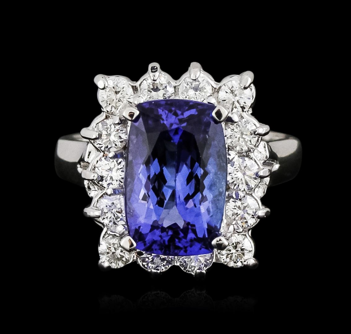 One electronically tested 14KT white gold ladies combination cast & assembled tanzanite and diamond ring with a bright polish finish. Identified with markings of "14K". Condition is new. Containing: One prong set rectangular cushion modified brilliant cut natural tanzanite, measuring 11.70 x 7.60 x 3.64mm, approximate weight of 2.55ct., clarity is eye clean, type I, medium light, slightly grayish, violet color, (GIA V 4/2), cut is good. Fourteen prong set round brilliant cut diamonds, measuring 2.50 - 2.50 x 1.50mm (depth est.) approximate total weight of 14 Stones = 0.80ct. Clarity: SI-1 to SI-2. Color: I - J, Cut is Good. Colored gemstones are presumed to have been subjected to commonly used enhancement processes. All diamonds and colored gemstones are graded in the mounting, unless otherwise stated. Total Weight of Colored Stones 2.55ct. Total Weight of Diamonds 0.80ct. Total Weight of Ring 6.60 grams. GGL Appraised at $4,995.00.