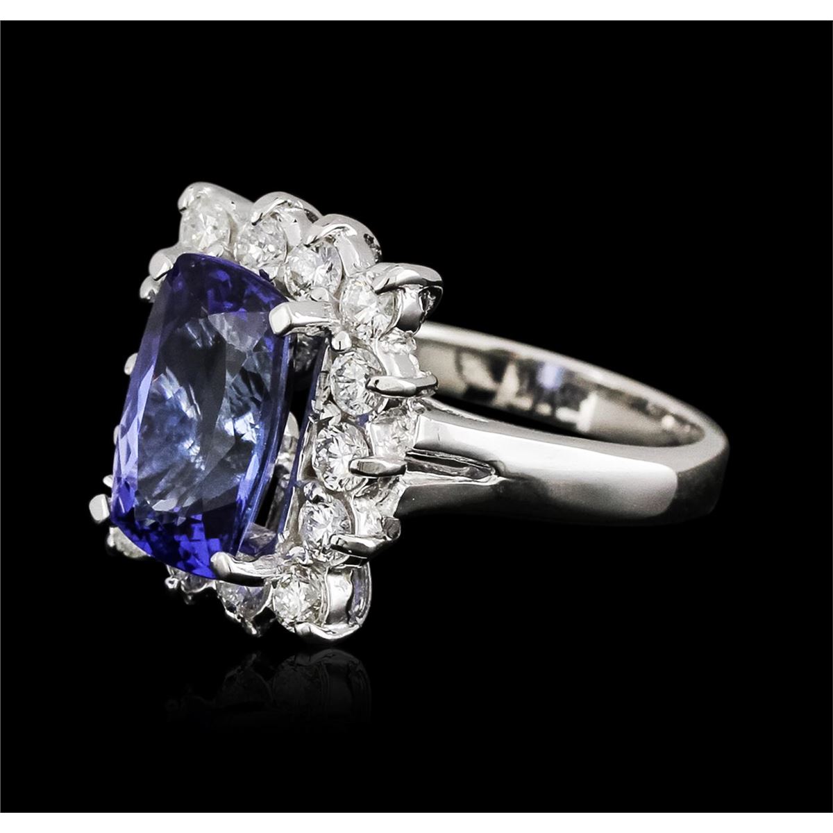 One electronically tested 14KT white gold ladies combination cast & assembled tanzanite and diamond ring with a bright polish finish. Identified with markings of "14K". Condition is new. Containing: One prong set rectangular cushion modified brilliant cut natural tanzanite, measuring 11.70 x 7.60 x 3.64mm, approximate weight of 2.55ct., clarity is eye clean, type I, medium light, slightly grayish, violet color, (GIA V 4/2), cut is good. Fourteen prong set round brilliant cut diamonds, measuring 2.50 - 2.50 x 1.50mm (depth est.) approximate total weight of 14 Stones = 0.80ct. Clarity: SI-1 to SI-2. Color: I - J, Cut is Good. Colored gemstones are presumed to have been subjected to commonly used enhancement processes. All diamonds and colored gemstones are graded in the mounting, unless otherwise stated. Total Weight of Colored Stones 2.55ct. Total Weight of Diamonds 0.80ct. Total Weight of Ring 6.60 grams. GGL Appraised at $4,995.00.