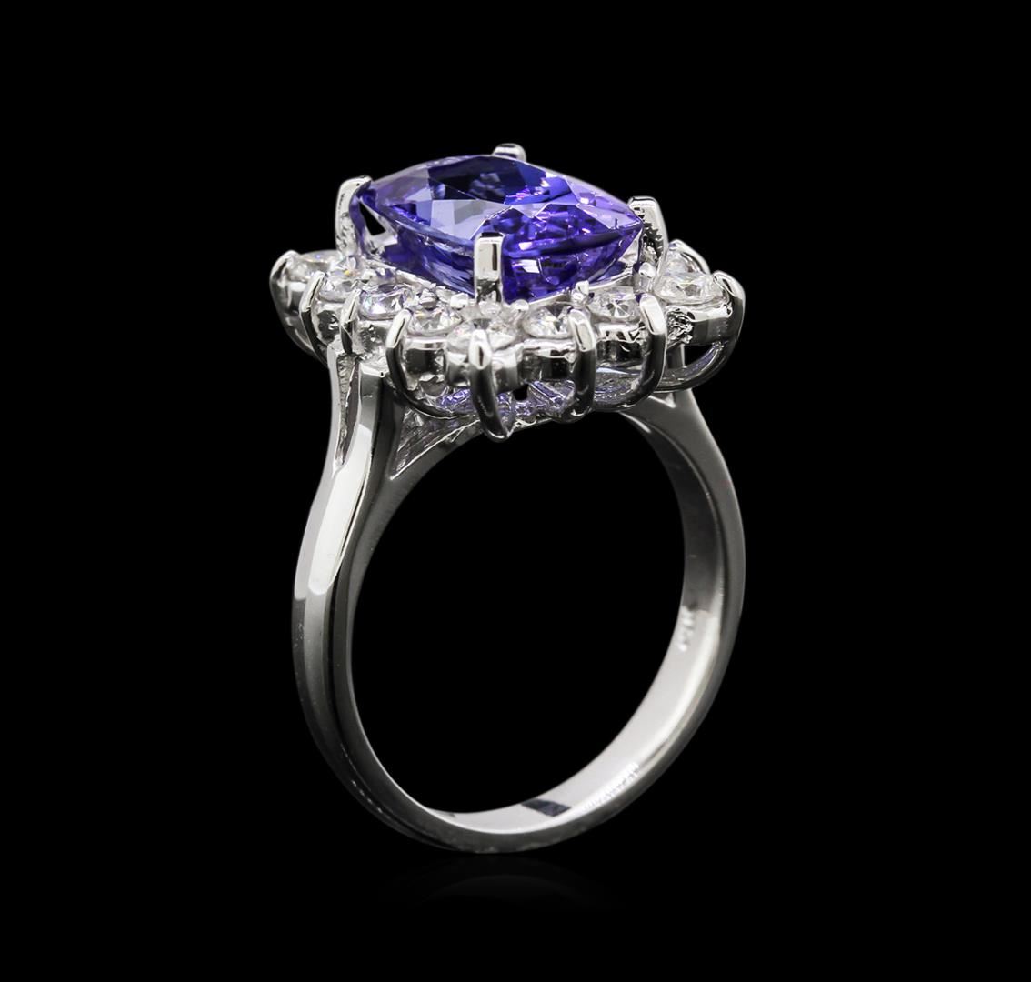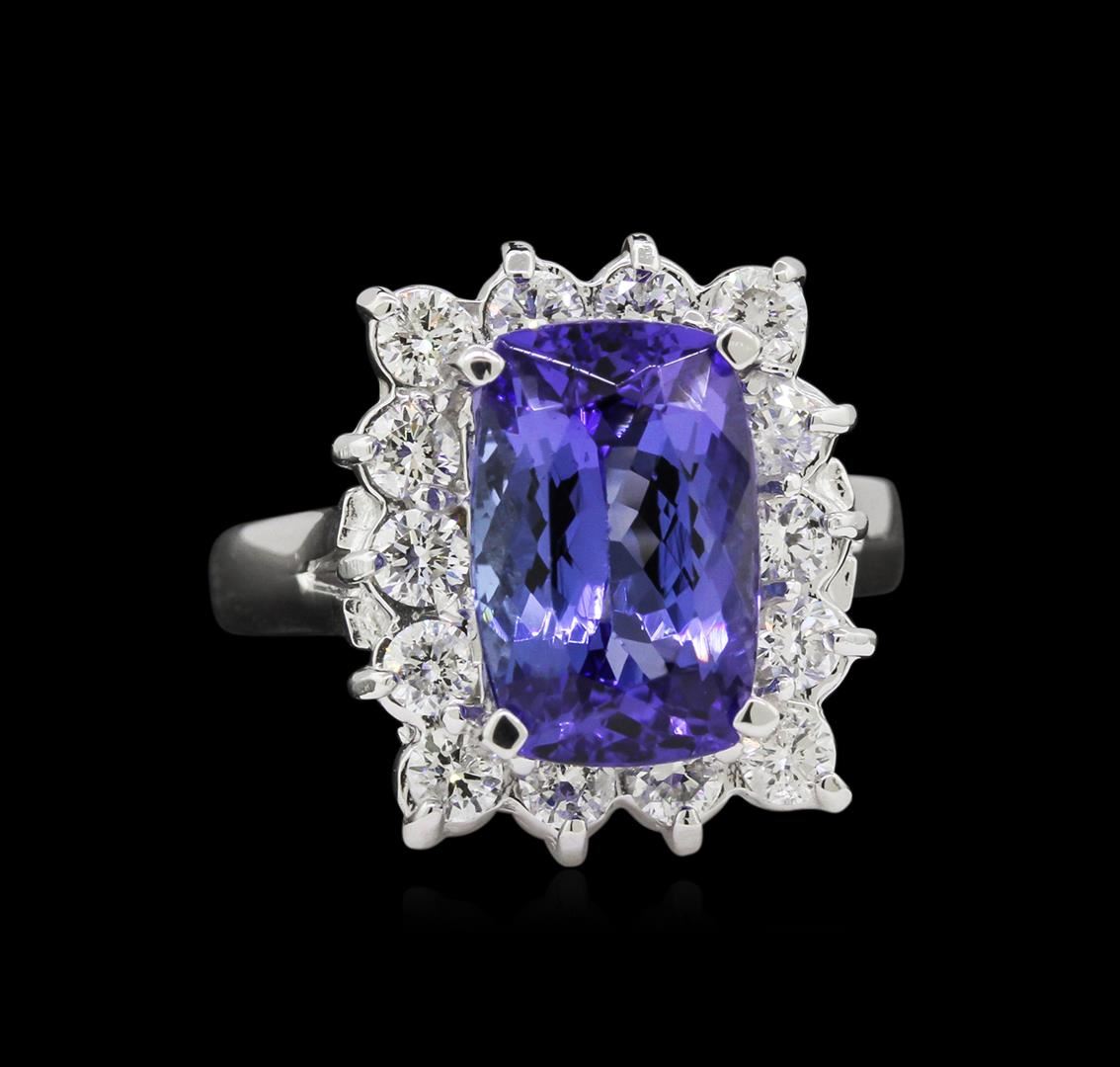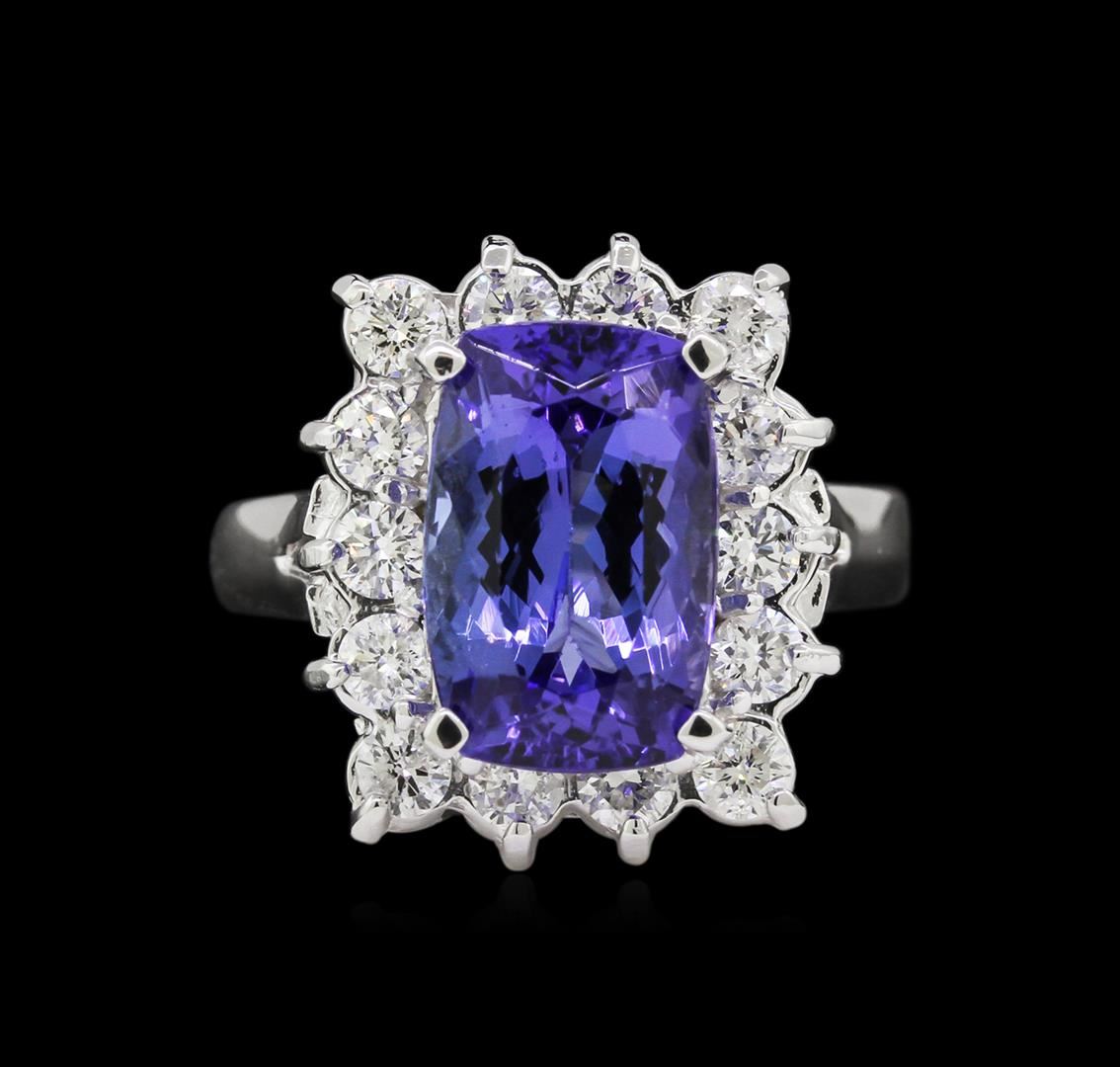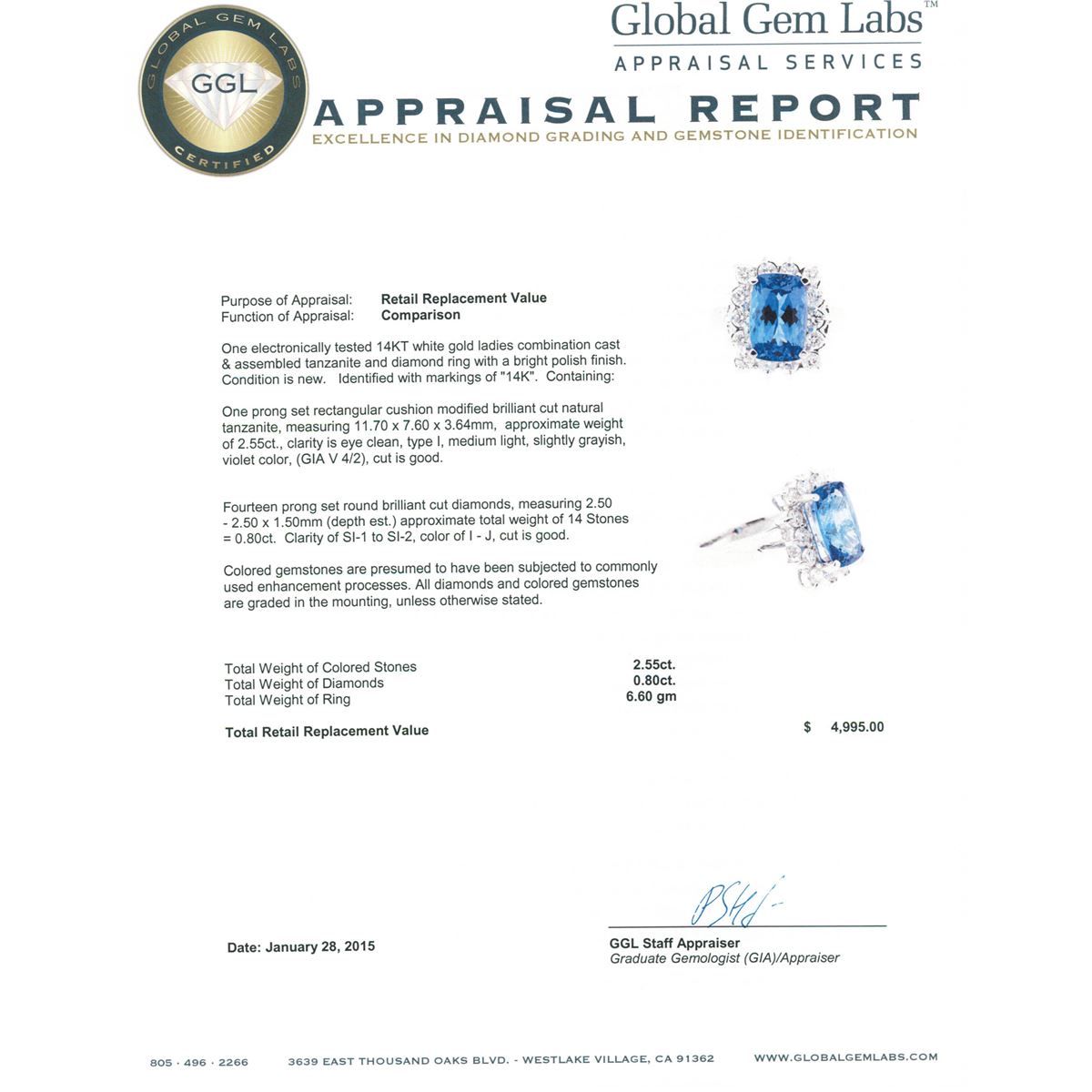 One electronically tested 14KT white gold ladies combination cast & assembled tanzanite and diamond ring with a bright polish finish. Identified with markings of "14K". Condition is new. Containing: One prong set rectangular cushion modified brilliant cut natural tanzanite, measuring 11.70 x 7.60 x 3.64mm, approximate weight of 2.55ct., clarity is eye clean, type I, medium light, slightly grayish, violet color, (GIA V 4/2), cut is good. Fourteen prong set round brilliant cut diamonds, measuring 2.50 - 2.50 x 1.50mm (depth est.) approximate total weight of 14 Stones = 0.80ct. Clarity: SI-1 to SI-2. Color: I - J, Cut is Good. Colored gemstones are presumed to have been subjected to commonly used enhancement processes. All diamonds and colored gemstones are graded in the mounting, unless otherwise stated. Total Weight of Colored Stones 2.55ct. Total Weight of Diamonds 0.80ct. Total Weight of Ring 6.60 grams. GGL Appraised at $4,995.00.