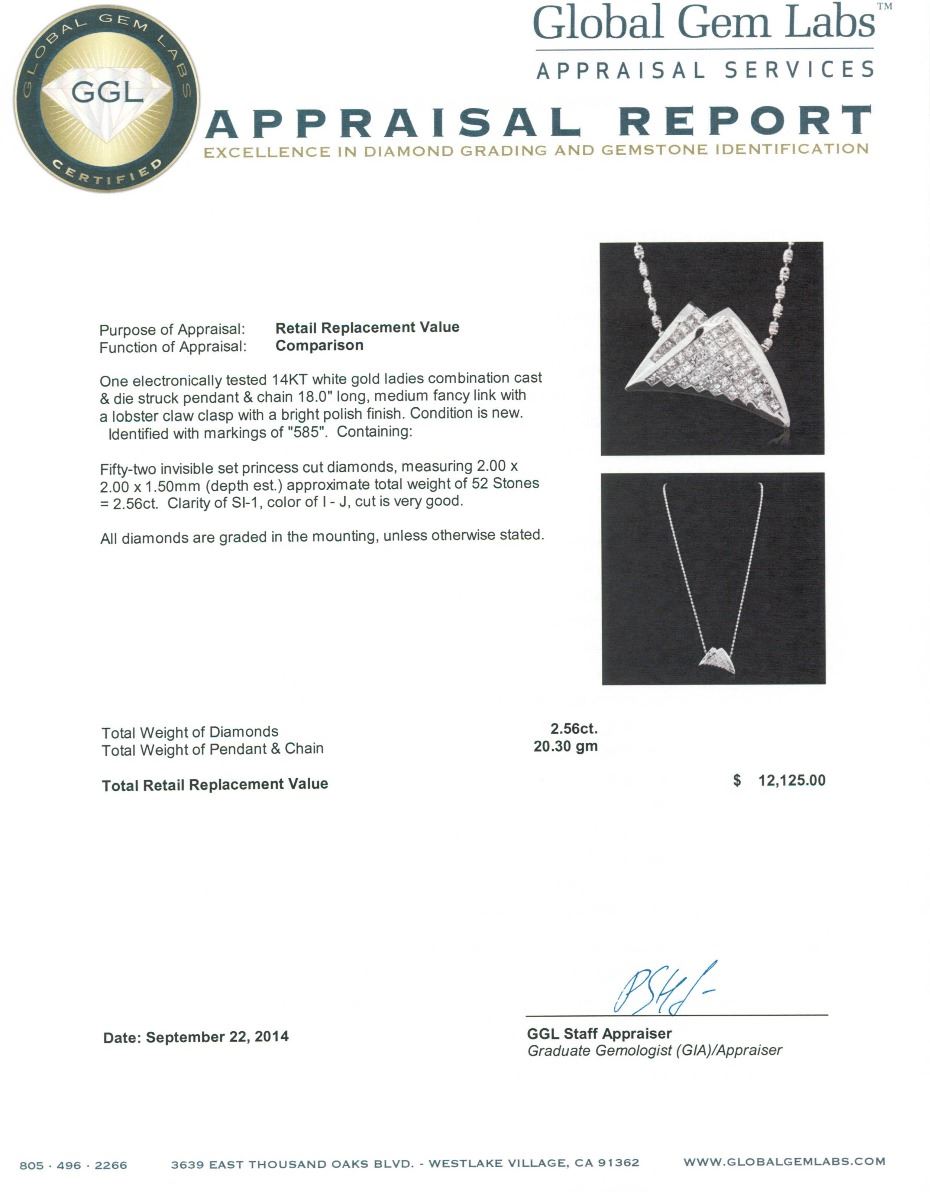 One electronically tested 14KT white gold ladies combination cast & die struck pendant & chain 18.0" long, medium fancy link with a lobster claw clasp with a bright polish finish. Identified with markings of "585". Condition is new. Containing: Fifty-Two invisible set princess cut diamonds, measuring 2.00 x 2.00 x 1.50mm (depth est.) approximate total weight of 52 Stones = 2.56ct. Clarity: SI-1. Color: I - J, Cut is Very Good. All diamonds are graded in the mounting, unless otherwise stated. Total Weight of Diamonds 2.56ct. Total Weight of Pendant & Chain 20.30 grams. GGL Appraised at $12,125.00.