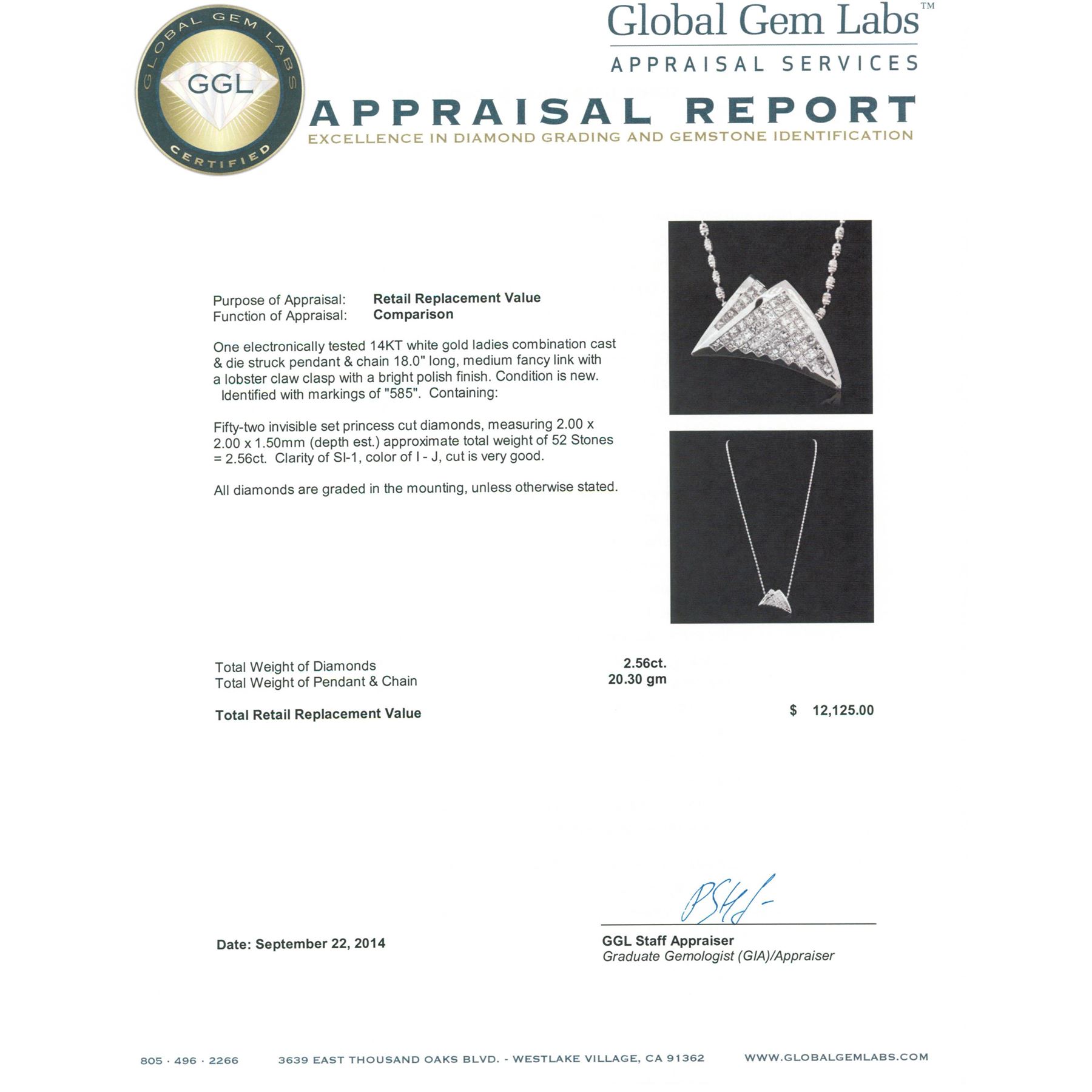 One electronically tested 14KT white gold ladies combination cast & die struck pendant & chain 18.0" long, medium fancy link with a lobster claw clasp with a bright polish finish. Identified with markings of "585". Condition is new. Containing: Fifty-Two invisible set princess cut diamonds, measuring 2.00 x 2.00 x 1.50mm (depth est.) approximate total weight of 52 Stones = 2.56ct. Clarity: SI-1. Color: I - J, Cut is Very Good. All diamonds are graded in the mounting, unless otherwise stated. Total Weight of Diamonds 2.56ct. Total Weight of Pendant & Chain 20.30 grams. GGL Appraised.