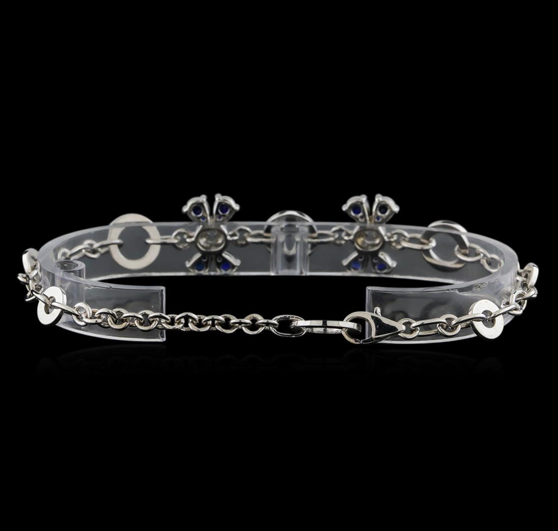 One electronically tested 14KT white gold ladies combination cast & assembled bracelet with a lobster claw clasp with a bright polish finish. Measurements: 8" in length. Identified with markings of "14K". Condition is new. Containing: Eight prong set pear modified brilliant cut natural blue sapphires, measuring 5.00 x 3.50 x 2.28mm, approximate total weight of 2.56ct., clarity is heavily included, type II, dark, moderately strong, blue color, (GIA B 7/4), cut is good. Eighty prong set round brilliant cut diamonds, measuring 1.00 - 1.00 x 0.60mm (depth est.) approximate total weight of 80 Stones = 0.29ct. Clarity: I-2 to I-3. Color: I - J. Colored gemstones are presumed to have been subjected to commonly used enhancement processes. All diamonds and colored gemstones are graded in the mounting, unless otherwise stated. Total Weight of Colored Stones 2.56ct. Total Weight of Diamonds 0.29ct. Total Weight of Bracelet 12.90 grams. GGL Appraised at $6,620.00.