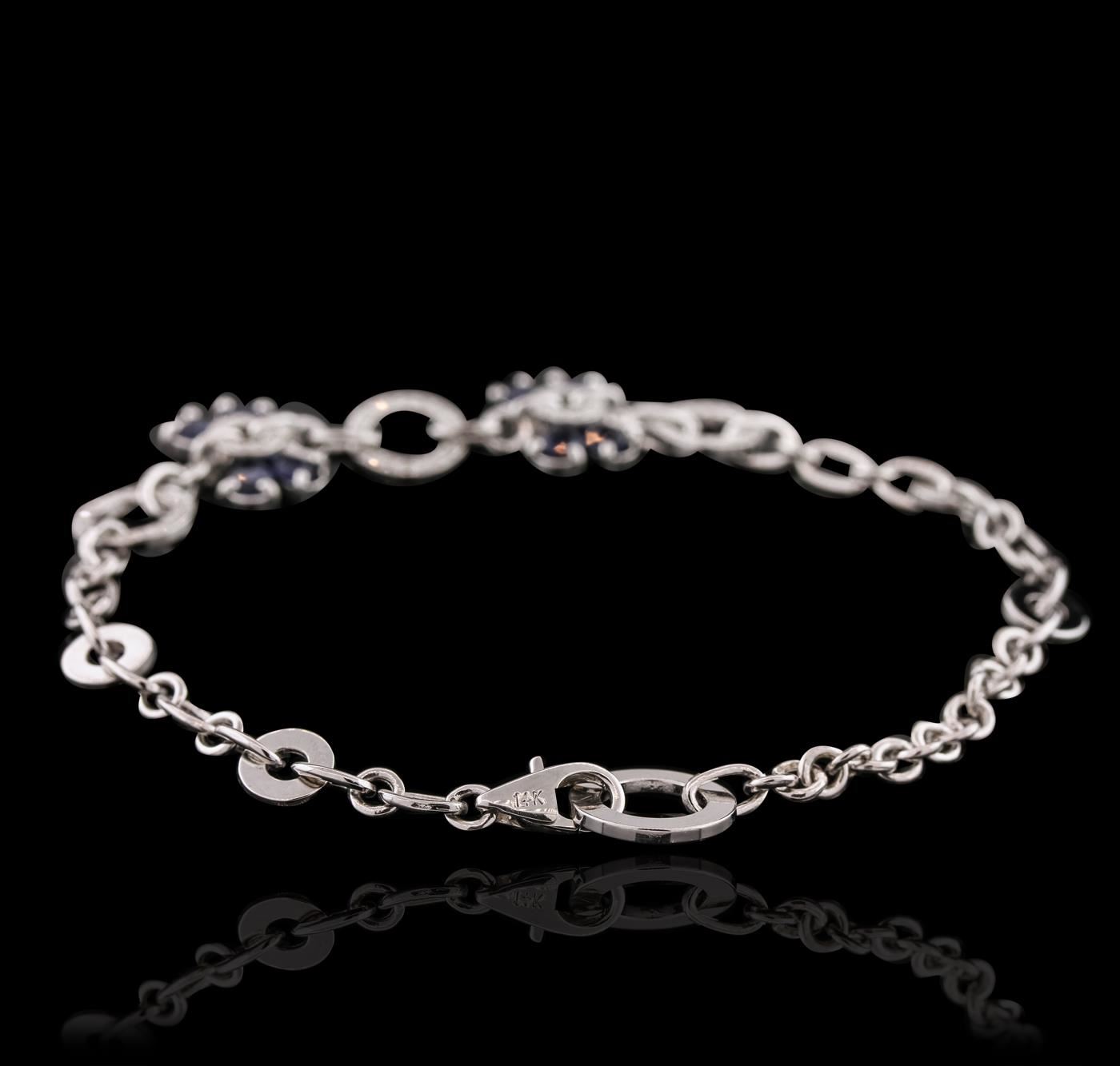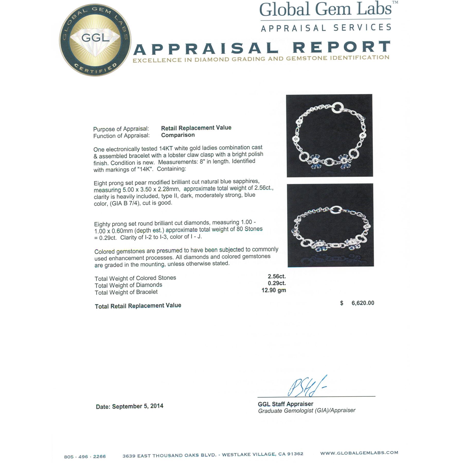 One electronically tested 14KT white gold ladies combination cast & assembled bracelet with a lobster claw clasp with a bright polish finish. Measurements: 8" in length. Identified with markings of "14K". Condition is new. Containing: Eight prong set pear modified brilliant cut natural blue sapphires, measuring 5.00 x 3.50 x 2.28mm, approximate total weight of 2.56ct., clarity is heavily included, type II, dark, moderately strong, blue color, (GIA B 7/4), cut is good. Eighty prong set round brilliant cut diamonds, measuring 1.00 - 1.00 x 0.60mm (depth est.) approximate total weight of 80 Stones = 0.29ct. Clarity: I-2 to I-3. Color: I - J. Colored gemstones are presumed to have been subjected to commonly used enhancement processes. All diamonds and colored gemstones are graded in the mounting, unless otherwise stated. Total Weight of Colored Stones 2.56ct. Total Weight of Diamonds 0.29ct. Total Weight of Bracelet 12.90 grams. GGL Appraised at $6,620.00.