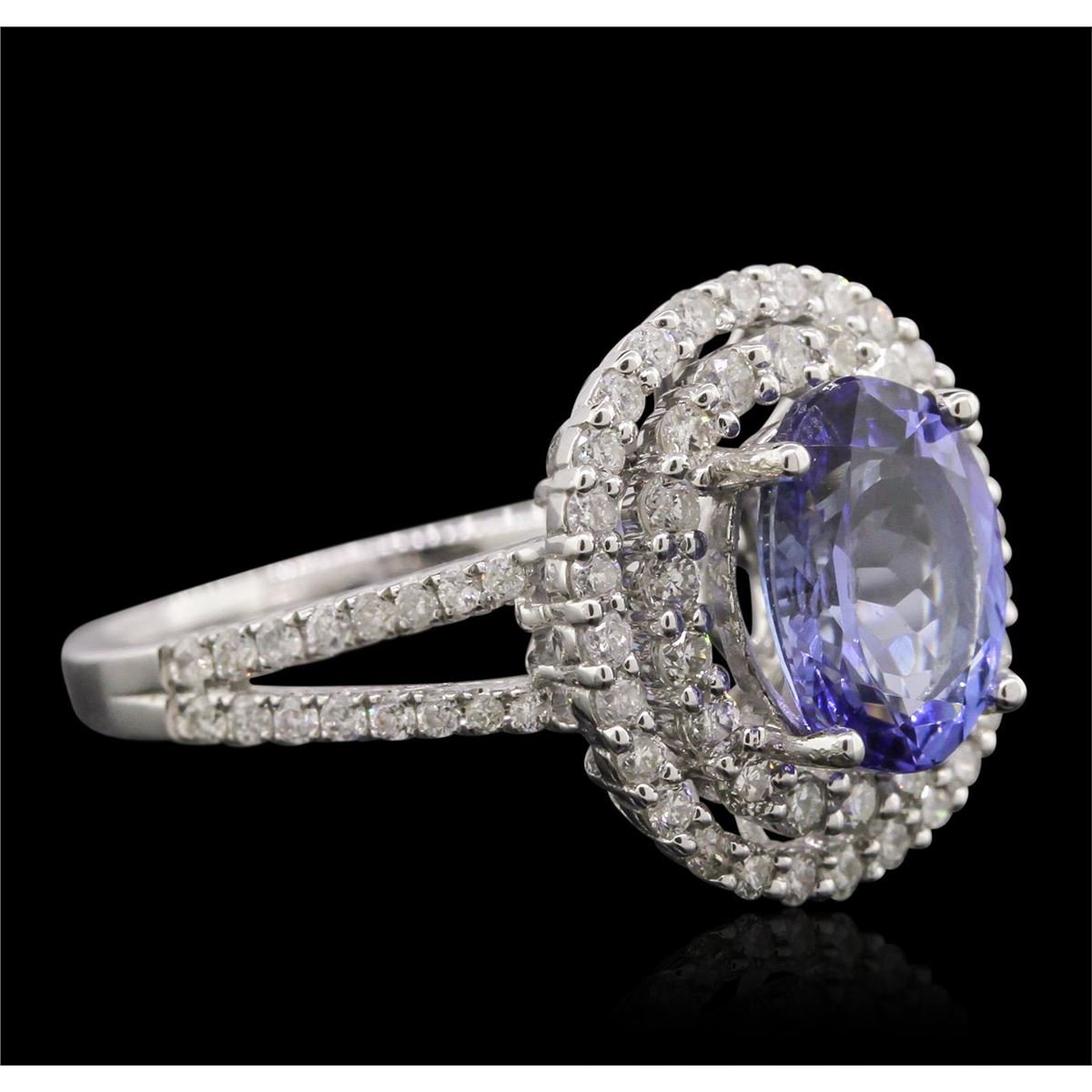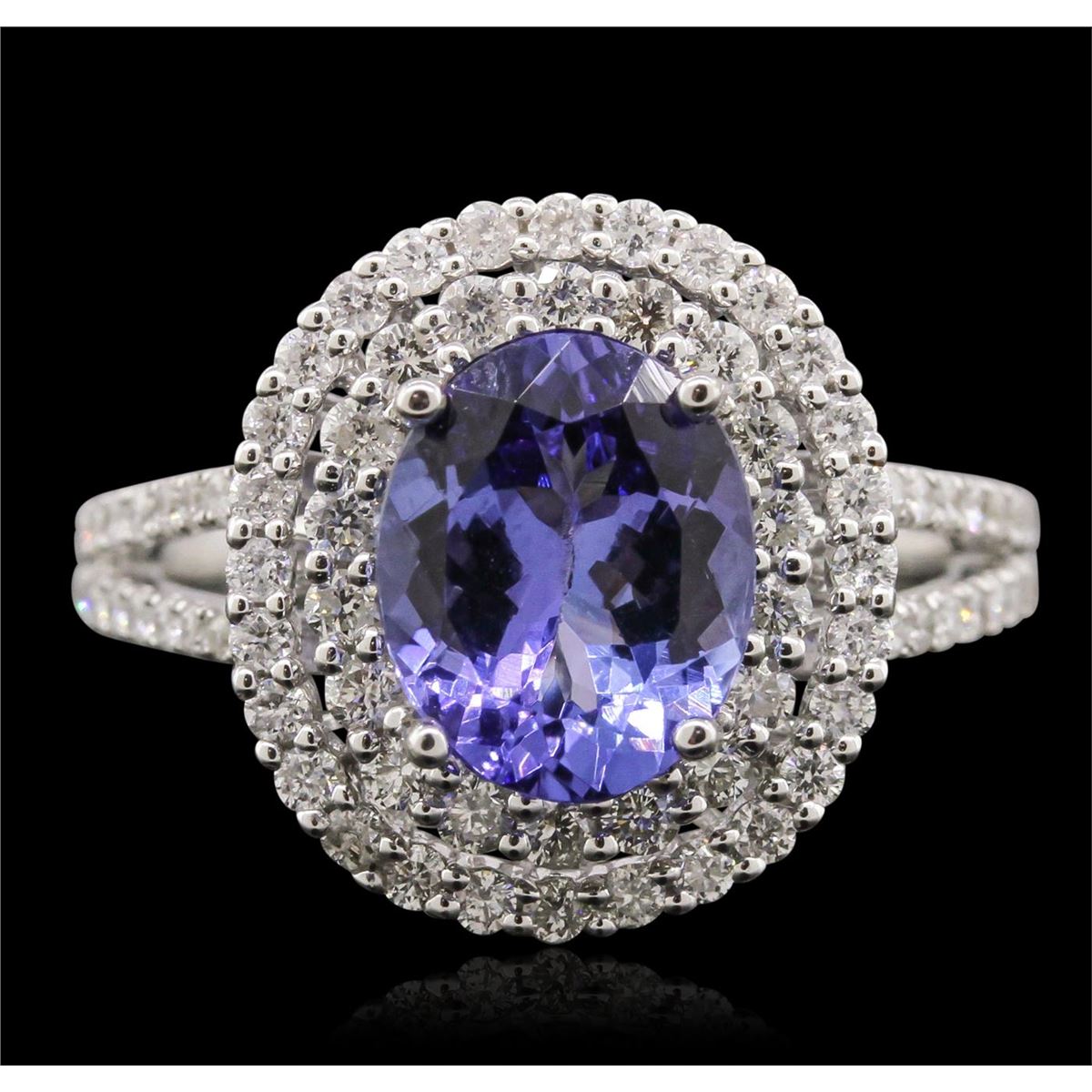 One electronically tested 14KT white gold Ladies combination cast & assembled ring with a bright polish finish. Condition is new. Identified with markings of "14K". Containing: One prong set oval modified brilliant cut natural tanzanite, measuring 9.80 x 7.80 x 4.94mm, approximate weight of 2.56ct., clarity is eye clean, type I, medium light, moderately strong, violet color, (GIA V 4/4), cut is good. Colored gemstones are presumed to have been subjected to commonly used color/clarity enhancement processes. Seventy-Eight prong set round brilliant cut diamonds, measuring 1.20 - 1.20 x 0.72mm (depth est.) approximate. Total Weight of 78 Stones = 0.49ct. . Clarity: I-1 to I-2. Color: I - J, Cut is Good. . Total Weight of Colored Stones 2.56ct. Total Weight of Diamonds 0.49ct. Total Weight of Ring 5.30 grams. GGL Appraised at $5,925.00.