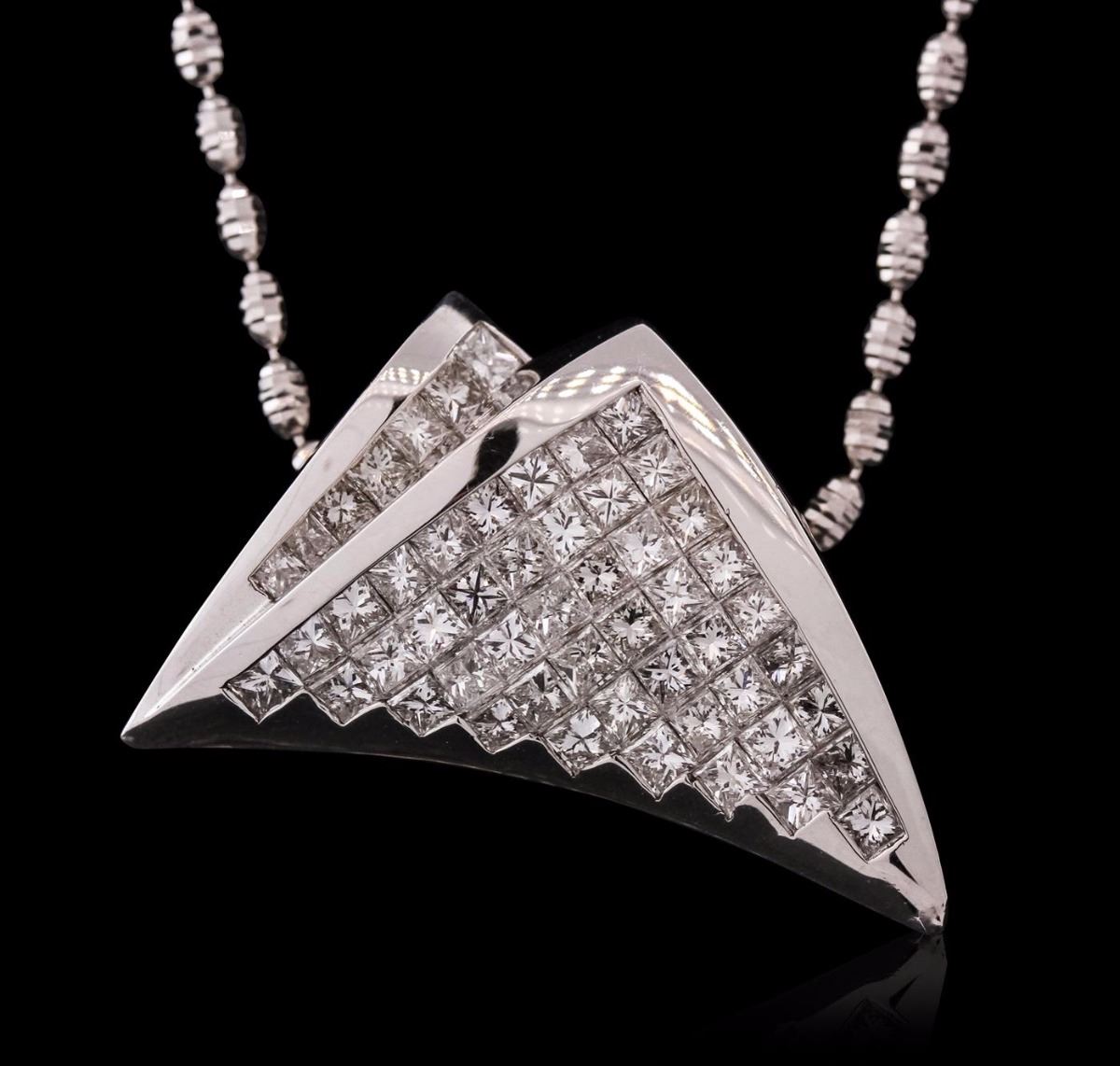 One electronically tested 14KT white gold ladies combination cast & die struck pendant & chain 18.0" long, medium fancy link with a lobster claw clasp with a bright polish finish. Identified with markings of "585". Condition is new. Containing: Fifty-Two invisible set princess cut diamonds, measuring 2.00 x 2.00 x 1.50mm (depth est.) approximate total weight of 52 Stones = 2.56ct. Clarity: SI-1. Color: I - J, Cut is Very Good. All diamonds are graded in the mounting, unless otherwise stated. Total Weight of Diamonds 2.56ct. Total Weight of Pendant & Chain 20.30 grams. GGL Appraised at $12,125.00.