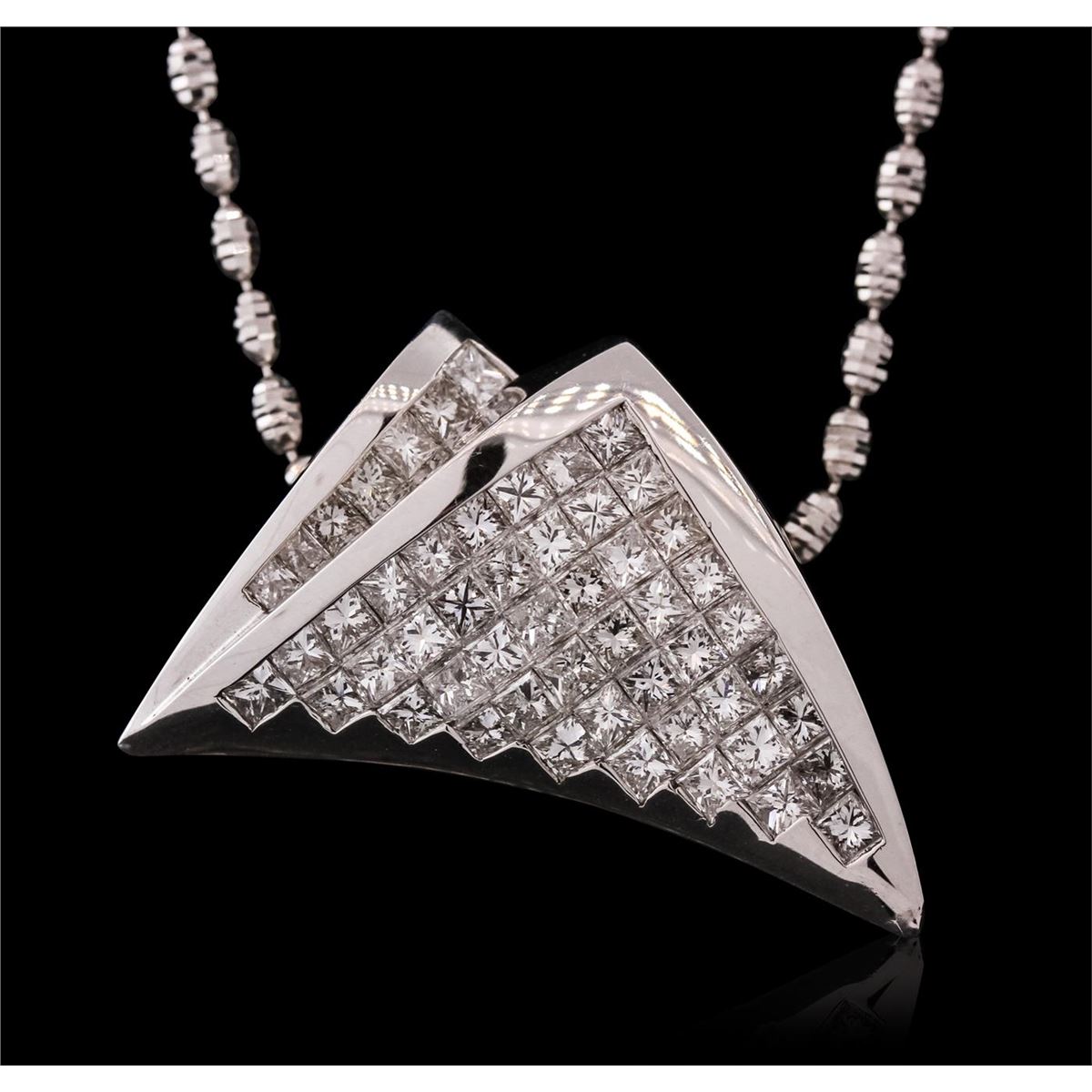One electronically tested 14KT white gold ladies combination cast & die struck pendant & chain 18.0" long, medium fancy link with a lobster claw clasp with a bright polish finish. Identified with markings of "585". Condition is new. Containing: Fifty-Two invisible set princess cut diamonds, measuring 2.00 x 2.00 x 1.50mm (depth est.) approximate total weight of 52 Stones = 2.56ct. Clarity: SI-1. Color: I - J, Cut is Very Good. All diamonds are graded in the mounting, unless otherwise stated. Total Weight of Diamonds 2.56ct. Total Weight of Pendant & Chain 20.30 grams. GGL Appraised at $12,125.00.