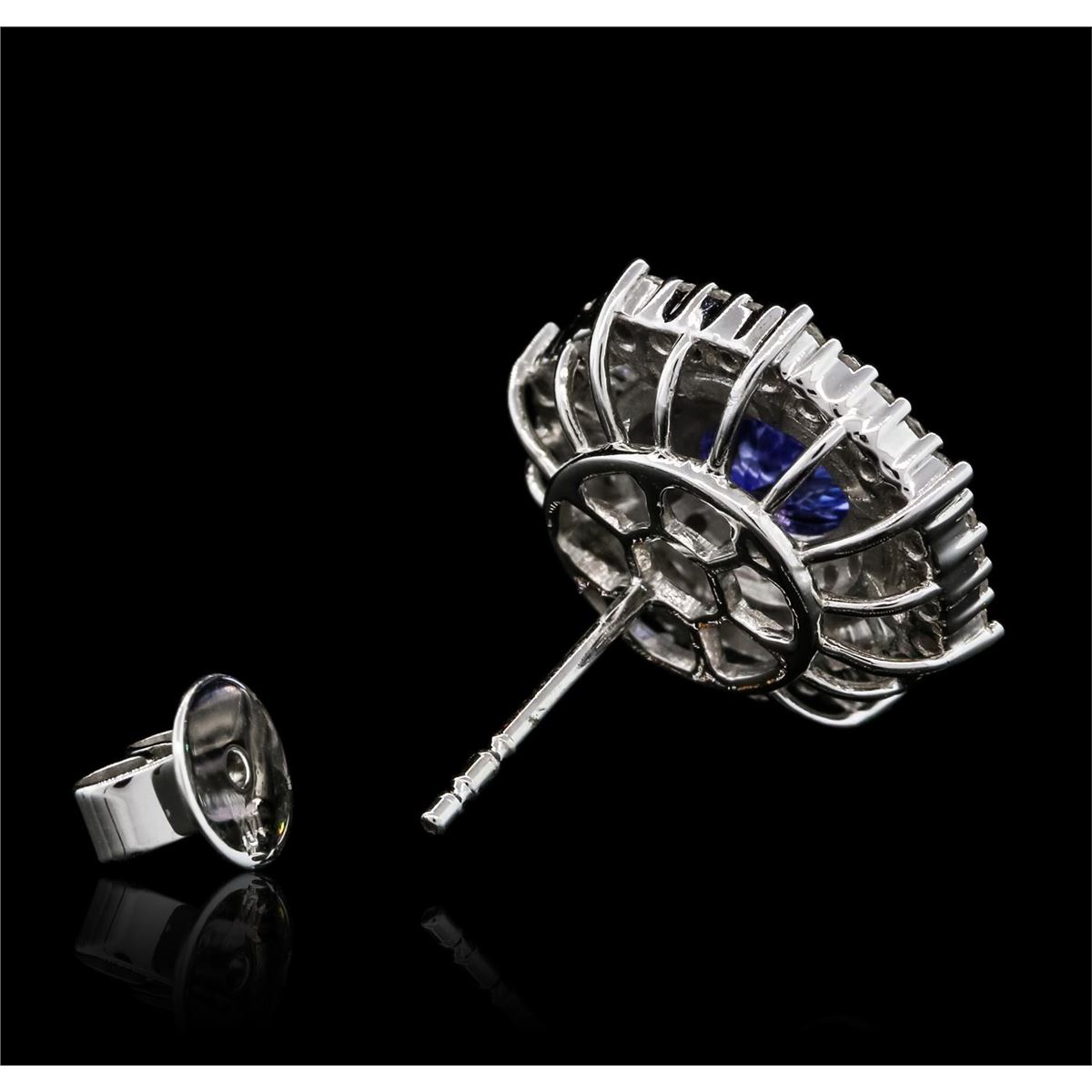One pair electronically tested 14KT white gold ladies combination cast & assembled tanzanite and diamond earrings with friction posts with a bright polish finish. Identified with markings of "14K". Condition is new. Containing: Two prong set oval modified brilliant cut natural tanzanites, measuring 7.80 x 6.00 x 3.90mm, approximate total weight of 2.56ct., clarity is eye clean, type I, medium, moderately strong, violet color, (GIA V 5/4), cut is good. One Hundred Two prong set round brilliant cut diamonds, measuring 1.30 - 1.00 x 0.69mm (depth est.) approximate total weight of 102 Stones = 0.56ct. Clarity: SI-1 to SI-2. Color: I - J, Cut is Good. Eighty-Eight channel set baguette cut diamonds, measuring 1.50 x 1.30 x 1.11mm (depth est.) approximate total weight of 88 Stones = 1.74ct. Clarity: SI-1 to SI-2. Color: H - I, Cut is Good. Colored gemstones are presumed to have been subjected to commonly used enhancement processes. All diamonds and colored gemstones are graded in the mounting, unless otherwise stated. Total Weight of Colored Stones 2.56ct. Total Weight of Diamonds 2.30ct. Total Weight of Earrings 8.00 grams. GGL Appraised at $7,150.00.