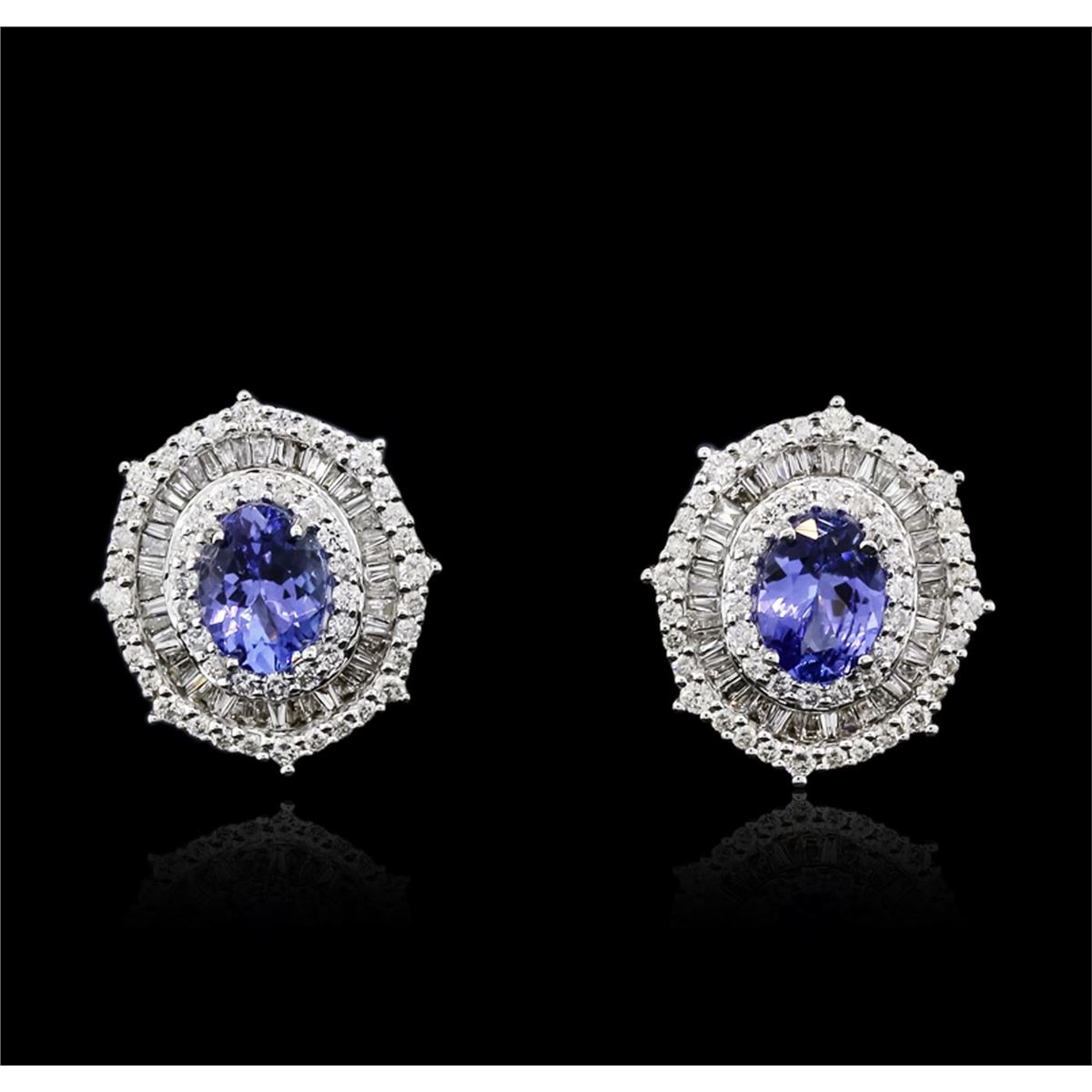 One pair electronically tested 14KT white gold ladies combination cast & assembled tanzanite and diamond earrings with friction posts with a bright polish finish. Identified with markings of "14K". Condition is new. Containing: Two prong set oval modified brilliant cut natural tanzanites, measuring 7.80 x 6.00 x 3.90mm, approximate total weight of 2.56ct., clarity is eye clean, type I, medium, moderately strong, violet color, (GIA V 5/4), cut is good. One Hundred Two prong set round brilliant cut diamonds, measuring 1.30 - 1.00 x 0.69mm (depth est.) approximate total weight of 102 Stones = 0.56ct. Clarity: SI-1 to SI-2. Color: I - J, Cut is Good. Eighty-Eight channel set baguette cut diamonds, measuring 1.50 x 1.30 x 1.11mm (depth est.) approximate total weight of 88 Stones = 1.74ct. Clarity: SI-1 to SI-2. Color: H - I, Cut is Good. Colored gemstones are presumed to have been subjected to commonly used enhancement processes. All diamonds and colored gemstones are graded in the mounting, unless otherwise stated. Total Weight of Colored Stones 2.56ct. Total Weight of Diamonds 2.30ct. Total Weight of Earrings 8.00 grams. GGL Appraised at $7,150.00.