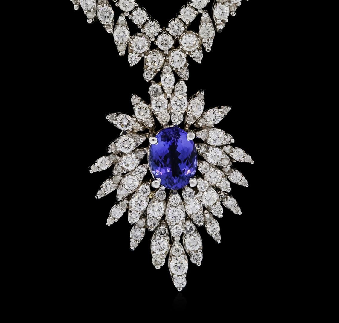 One electronically tested 14KT white gold ladies cast tanzanite and diamond necklace with a hidden box clasp with safety closer with a bright polish finish. Measurements: 16" in length Identified with markings of "K14". Condition is new. Containing: One prong set oval modified brilliant cut natural tanzanite, measuring 10.00 x 7.50 x 4.88mm, approximate weight of 2.57ct., clarity is eye clean, type I, medium, moderately strong, violet color, (GIA V 5/4), cut is good. Two Hundred Seventy-One prong set round brilliant cut diamonds, measuring 2.80 - 1.30 x 1.23mm (depth est.) approximate total weight of 271 Stones = 15.89ct. Clarity: SI-1 to I-1. Color: I - J, Cut is Good. Colored gemstones are presumed to have been subjected to commonly used enhancement processes. All diamonds and colored gemstones are graded in the mounting, unless otherwise stated. Total Weight of Colored Stones 2.57ct. Total Weight of Diamonds 15.89ct. Total Weight of Necklace 39.70 grams. GGL Appraised at $33,785.00.