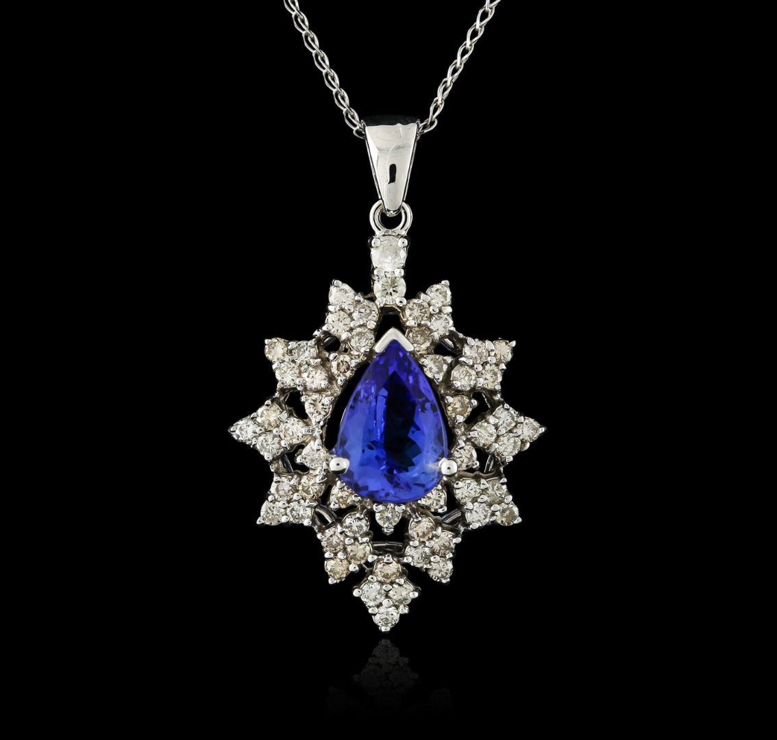 One electronically tested 14KT white gold ladies combination cast & assembled tanzanite and diamond pendant & chain 18.0" long, thin curb link with a spring ring clasp with a bright polish finish. Identified with markings of "14K". Condition is new. Containing: One prong set pear modified brilliant cut natural tanzanite, measuring 10.01 x 7.28 x 5.26mm, approximate weight of 2.57ct., clarity is eye clean, type I, medium light, very slightly grayish, violet color, (GIA V 4/3), cut is good. Fifty-Five prong set round brilliant cut diamonds, measuring 1.70 - 1.50 x 0.96mm (depth est.) approximate total weight of 55 Stones = 0.82ct. Clarity: SI-2 to I-2. Color: K - L, Cut is Good. Diamonds and colored gemstones are graded in the mounting, unless otherwise stated. Colored gemstones are presumed to have been subjected to commonly used enhancement processes. Total Weight of Colored Stones 2.57ct. Total Weight of Diamonds 0.82ct. Total Weight of Pendant & Chain 6.40 grams. GGL Appraised at $3,180.00.