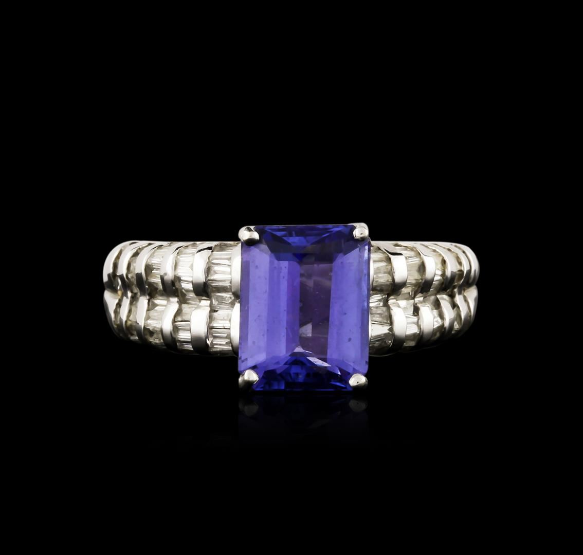 One electronically tested 14KT white gold ladies cast tanzanite and diamond ring with a bright polish finish. The featured tanzanite is supported by diamond set shoulders, completed by a two and one-half millimeter wide band. Identified with markings of "14K". Condition is new, good workmanship. Containing: One prong set emerald step cut natural tanzanite, measuring 9.15 x 7.14 x 4.10mm, 6%. bulge factor, approximate weight of 2.57ct., clarity is eye clean, type I, medium dark, moderately strong, violetish blue color, (GIA vB 6/4), cut is good. Transmitting light with no distortion, transparent. Graded in the setting. Tanzanite is a very rare gemstone that is only found in the country of Tanzania. Originally discovered in 1967. Tiffany & Company, named the stone Tanzanite. It is found in the Usumburu Mountains that border the Umba Valley of northern Tanzania. Tanzanite occurs in gray, brown, violet, blue, reddish-purple, & green. The gem is interesting because of its exceptional pleochroism. Rotated in different directions a tanzanite will exhibit multiple changes of color. Tanzanite has a low tolerance to ultrasonic cleaning, and should not be cleaned using this method. One Hundred Two channel set baguette cut (tapered) diamonds, measuring from 1.50 x 1.10 x 0.77mm (depth est.) to 1.70 x 1.20 x 0.84mm (depth est.) approximate total weight of 102 Stones = 1.37ct. Graded in the setting. Clarity: I-1 to I-2. Color: H - J. Total Weight of Colored Stones 2.57ct. Total Weight of Diamonds 1.37ct. Total Weight of Ring 5.31 grams. AIG Appraised at $9,245.00.