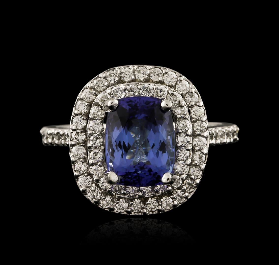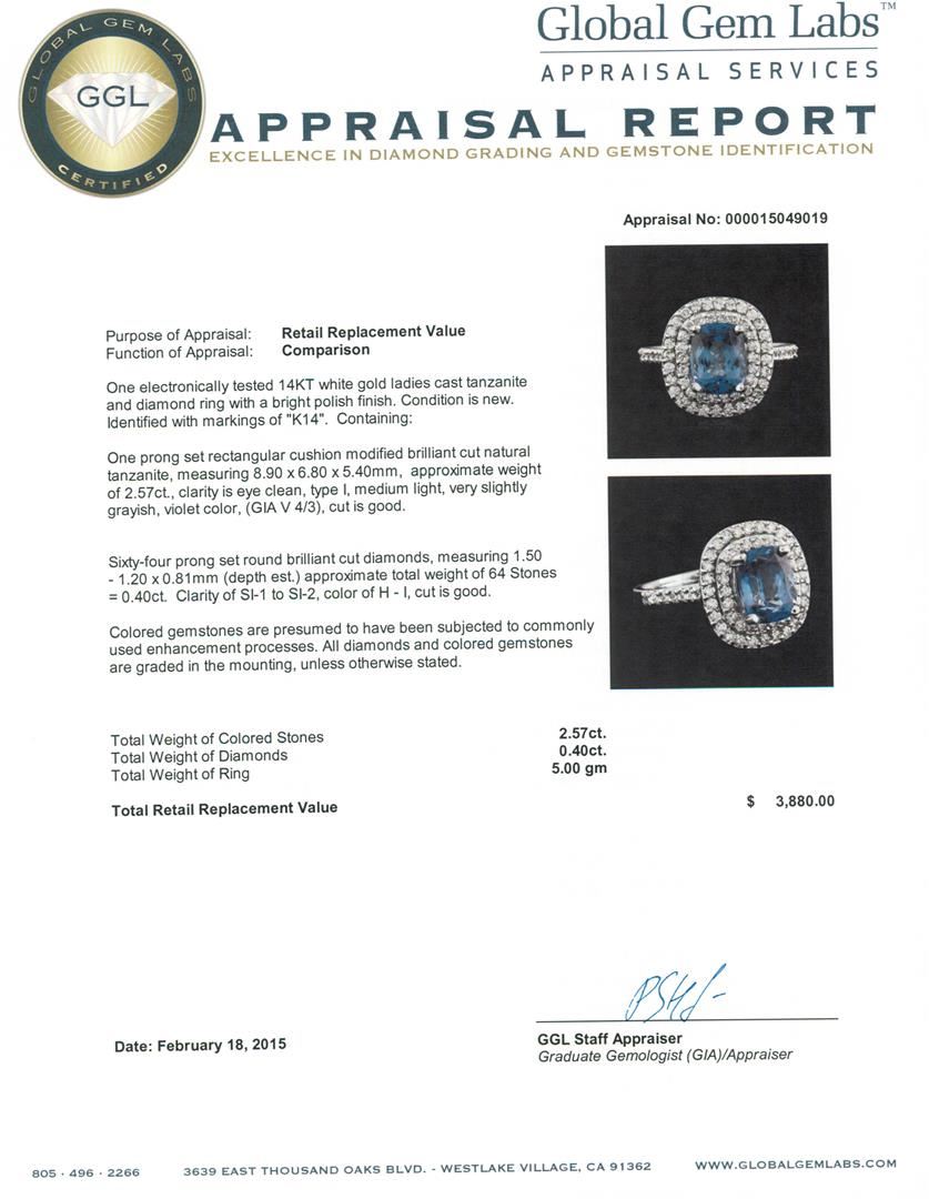 One electronically tested 14KT white gold ladies cast tanzanite and diamond ring with a bright polish finish. Identified with markings of "K14". Condition is new. Containing: One prong set rectangular cushion modified brilliant cut natural tanzanite, measuring 8.90 x 6.80 x 5.40mm, approximate weight of 2.57ct., clarity is eye clean, type I, medium light, very slightly grayish, violet color, (GIA V 4/3), cut is good. Sixty-Four prong set round brilliant cut diamonds, measuring 1.50 - 1.20 x 0.81mm (depth est.) approximate total weight of 64 Stones = 0.40ct. Clarity: SI-1 to SI-2. Color: H - I, Cut is Good. Colored gemstones are presumed to have been subjected to commonly used enhancement processes. All diamonds and colored gemstones are graded in the mounting, unless otherwise stated. Total Weight of Colored Stones 2.57ct. Total Weight of Diamonds 0.40ct. Total Weight of Ring 5.00 grams. GGL Appraised at $3,880.00.