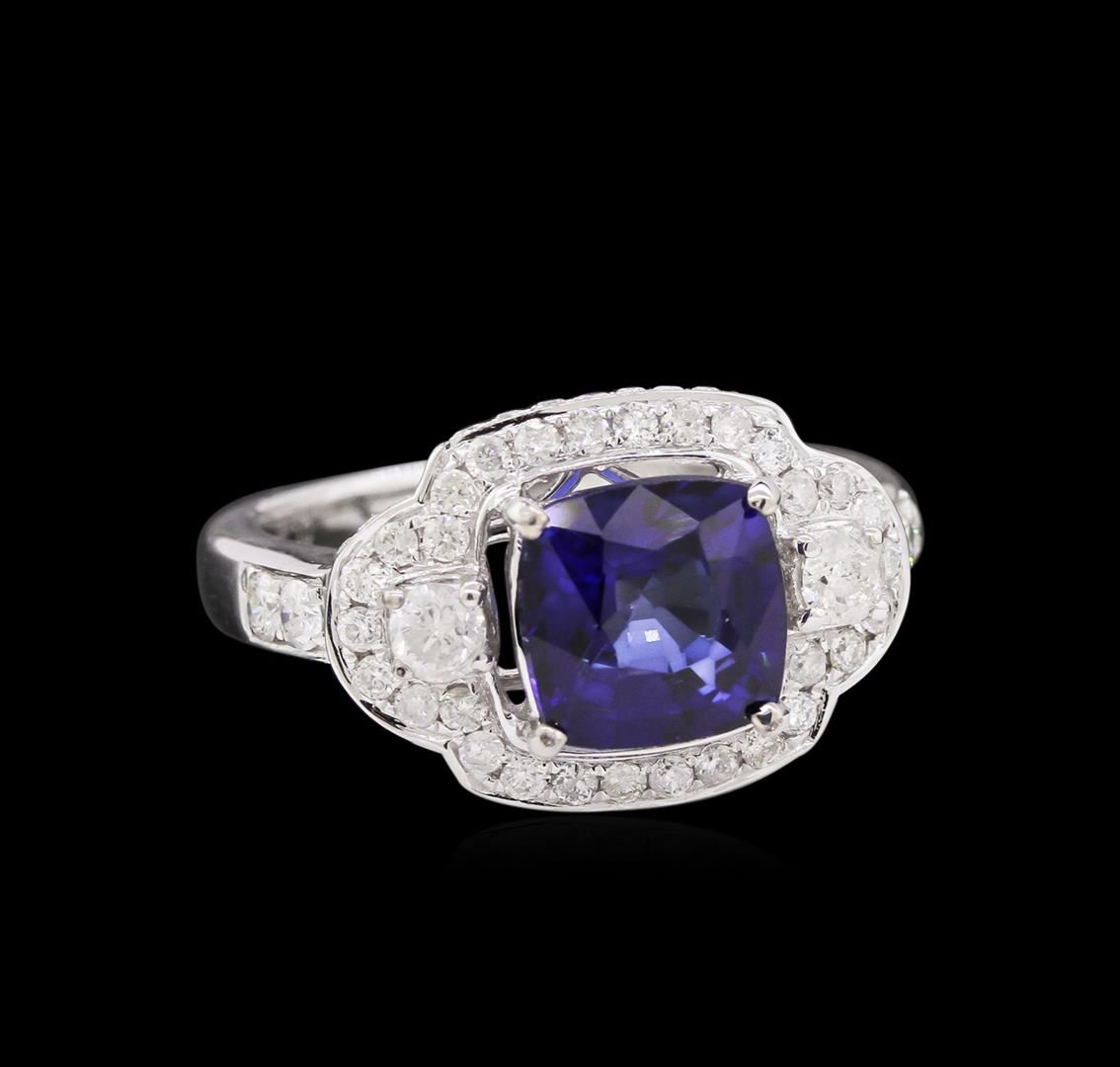 One electronically tested 14KT white gold ladies cast sapphire and diamond ring with a bright polish finish. Identified with markings of "14K". Condition is new. Containing: One prong set square cushion modified brilliant cut natural blue sapphire, measuring 7.50 x 7.50 x 4.88mm, approximate weight of 2.58ct., clarity is eye clean, type II, medium, moderately strong, blue color, (GIA B 5/4), cut is good. Two prong set round brilliant cut diamonds, measuring 2.90 - 2.90 x 1.74mm (depth est.) approximate total weight of 2 Stones = 0.18ct. Clarity: I-2. Color: H. Sixty-Seven prong set round brilliant cut diamonds, measuring 1.80 - 1.30 x 0.93mm (depth est.) approximate total weight of 67 Stones = 0.80ct. Clarity: SI-2 to I-1. Color: H - I. Colored gemstones are presumed to have been subjected to commonly used enhancement processes. All diamonds and colored gemstones are graded in the mounting, unless otherwise stated. Total Weight of Colored Stones 2.58ct. Total Weight of Diamonds 0.98ct. Total Weight of Ring 5.50 grams. GGL Appraised at $5,600.00.