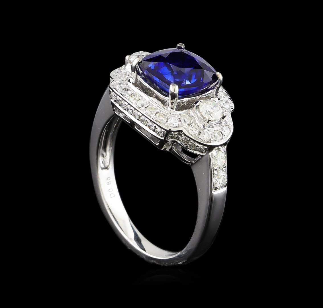 One electronically tested 14KT white gold ladies cast sapphire and diamond ring with a bright polish finish. Identified with markings of "14K". Condition is new. Containing: One prong set square cushion modified brilliant cut natural blue sapphire, measuring 7.50 x 7.50 x 4.88mm, approximate weight of 2.58ct., clarity is eye clean, type II, medium, moderately strong, blue color, (GIA B 5/4), cut is good. Two prong set round brilliant cut diamonds, measuring 2.90 - 2.90 x 1.74mm (depth est.) approximate total weight of 2 Stones = 0.18ct. Clarity: I-2. Color: H. Sixty-Seven prong set round brilliant cut diamonds, measuring 1.80 - 1.30 x 0.93mm (depth est.) approximate total weight of 67 Stones = 0.80ct. Clarity: SI-2 to I-1. Color: H - I. Colored gemstones are presumed to have been subjected to commonly used enhancement processes. All diamonds and colored gemstones are graded in the mounting, unless otherwise stated. Total Weight of Colored Stones 2.58ct. Total Weight of Diamonds 0.98ct. Total Weight of Ring 5.50 grams. GGL Appraised at $5,600.00.