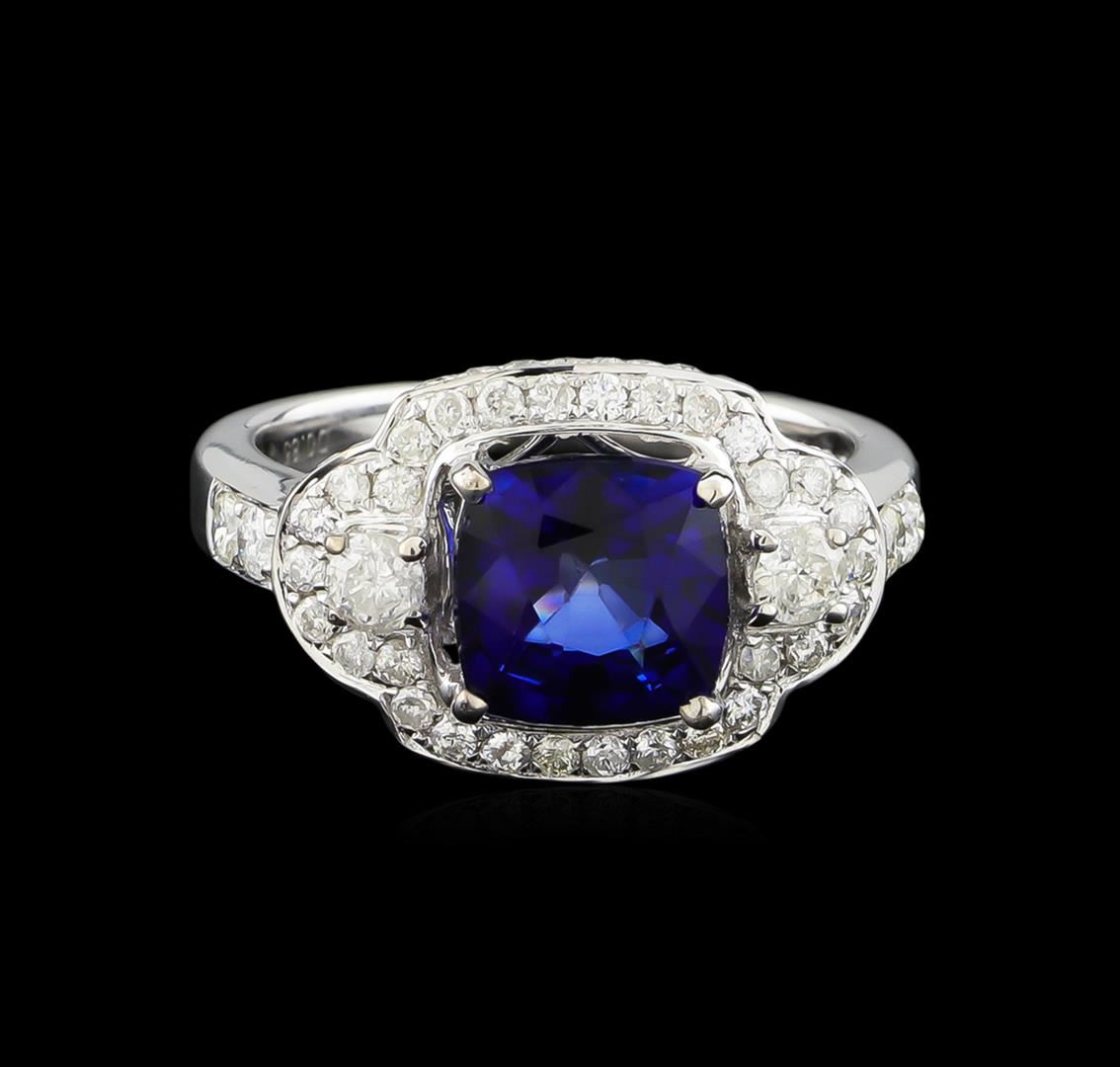 One electronically tested 14KT white gold ladies cast sapphire and diamond ring with a bright polish finish. Identified with markings of "14K". Condition is new. Containing: One prong set square cushion modified brilliant cut natural blue sapphire, measuring 7.50 x 7.50 x 4.88mm, approximate weight of 2.58ct., clarity is eye clean, type II, medium, moderately strong, blue color, (GIA B 5/4), cut is good. Two prong set round brilliant cut diamonds, measuring 2.90 - 2.90 x 1.74mm (depth est.) approximate total weight of 2 Stones = 0.18ct. Clarity: I-2. Color: H. Sixty-Seven prong set round brilliant cut diamonds, measuring 1.80 - 1.30 x 0.93mm (depth est.) approximate total weight of 67 Stones = 0.80ct. Clarity: SI-2 to I-1. Color: H - I. Colored gemstones are presumed to have been subjected to commonly used enhancement processes. All diamonds and colored gemstones are graded in the mounting, unless otherwise stated. Total Weight of Colored Stones 2.58ct. Total Weight of Diamonds 0.98ct. Total Weight of Ring 5.50 grams. GGL Appraised at $5,600.00.