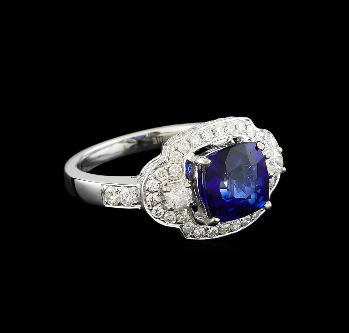 One electronically tested 14KT white gold ladies cast sapphire and diamond ring with a bright polish finish. Identified with markings of "14K". Condition is new. Containing: One prong set square cushion modified brilliant cut natural blue sapphire, measuring 7.50 x 7.50 x 4.88mm, approximate weight of 2.58ct., clarity is eye clean, type II, medium, moderately strong, blue color, (GIA B 5/4), cut is good. Two prong set round brilliant cut diamonds, measuring 2.90 - 2.90 x 1.74mm (depth est.) approximate total weight of 2 Stones = 0.18ct. Clarity: I-2. Color: H. Sixty-Seven prong set round brilliant cut diamonds, measuring 1.80 - 1.30 x 0.93mm (depth est.) approximate total weight of 67 Stones = 0.80ct. Clarity: SI-2 to I-1. Color: H - I. Colored gemstones are presumed to have been subjected to commonly used enhancement processes. All diamonds and colored gemstones are graded in the mounting, unless otherwise stated. Total Weight of Colored Stones 2.58ct. Total Weight of Diamonds 0.98ct. Total Weight of Ring 5.50 grams. GGL Appraised at $5,600.00.