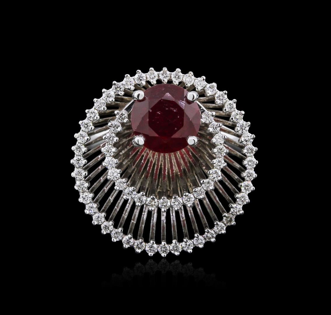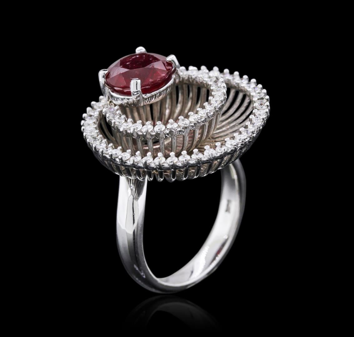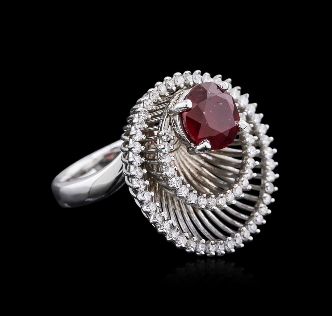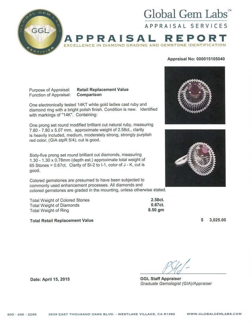 One electronically tested 14KT white gold ladies cast ruby and diamond ring with a bright polish finish. Identified with markings of "14K". Condition is new. Containing: One prong set round modified brilliant cut natural ruby, measuring 7.80 - 7.80 x 5.07 mm, approximate weight of 2.58ct., clarity is heavily included, medium, moderately strong, strongly purplish red color, (GIA stpR 5/4), cut is good. Sixty-Five prong set round brilliant cut diamonds, measuring 1.30 - 1.30 x 0.78mm (depth est.) approximate total weight of 65 Stones = 0.67ct. Clarity: SI-2 to I-1. Color: J - K, Cut is Good. Colored gemstones are presumed to have been subjected to commonly used enhancement processes. All diamonds and colored gemstones are graded in the mounting, unless otherwise stated. Total Weight of Colored Stones 2.58ct. Total Weight of Diamonds 0.67ct. Total Weight of Ring 8.50 grams. GGL Appraised at $3,025.00.