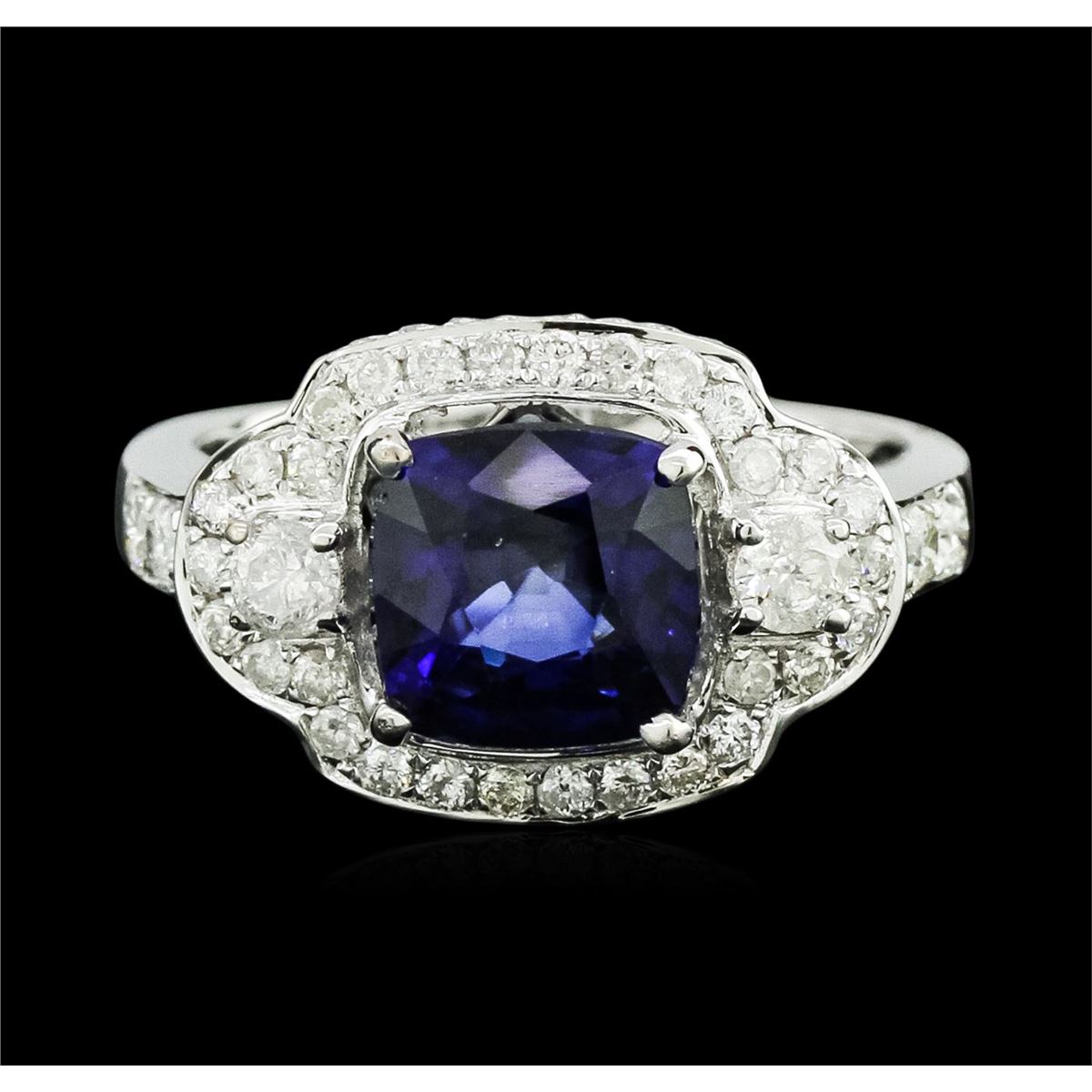 One electronically tested 14KT white gold ladies cast sapphire and diamond ring with a bright polish finish. Identified with markings of "14K". Condition is new. Containing: One prong set square cushion modified brilliant cut natural blue sapphire, measuring 7.50 x 7.50 x 4.88mm, approximate weight of 2.58ct., clarity is eye clean, type II, medium, moderately strong, blue color, (GIA B 5/4), cut is good. Two prong set round brilliant cut diamonds, measuring 2.90 - 2.90 x 1.74mm (depth est.) approximate total weight of 2 Stones = 0.18ct. Clarity: I-2. Color: H. Sixty-Seven prong set round brilliant cut diamonds, measuring 1.80 - 1.30 x 0.93mm (depth est.) approximate total weight of 67 Stones = 0.80ct. Clarity: SI-2 to I-1. Color: H - I. Colored gemstones are presumed to have been subjected to commonly used enhancement processes. All diamonds and colored gemstones are graded in the mounting, unless otherwise stated. Total Weight of Colored Stones 2.58ct. Total Weight of Diamonds 0.98ct. Total Weight of Ring 5.50 grams. GGL Appraised at $5,600.00.