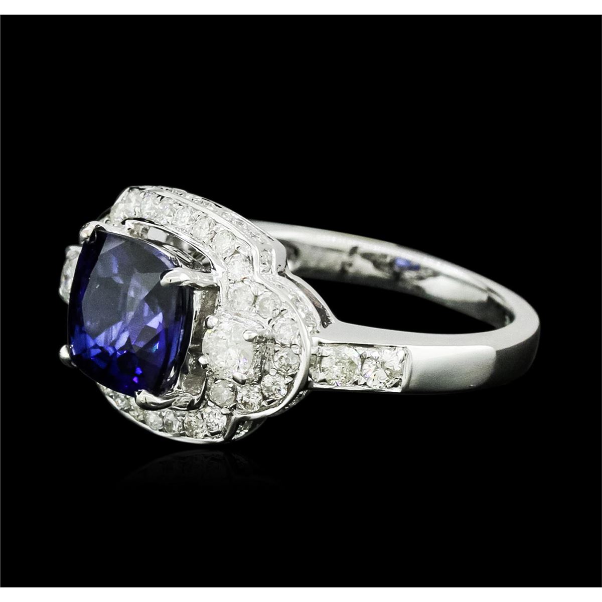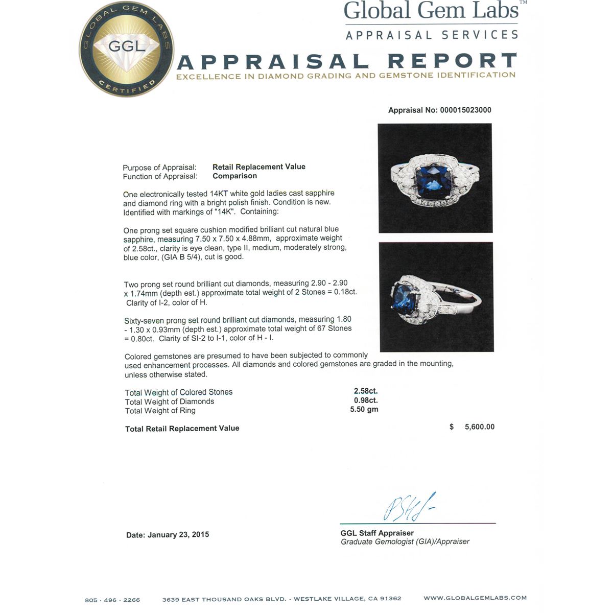 One electronically tested 14KT white gold ladies cast sapphire and diamond ring with a bright polish finish. Identified with markings of "14K". Condition is new. Containing: One prong set square cushion modified brilliant cut natural blue sapphire, measuring 7.50 x 7.50 x 4.88mm, approximate weight of 2.58ct., clarity is eye clean, type II, medium, moderately strong, blue color, (GIA B 5/4), cut is good. Two prong set round brilliant cut diamonds, measuring 2.90 - 2.90 x 1.74mm (depth est.) approximate total weight of 2 Stones = 0.18ct. Clarity: I-2. Color: H. Sixty-Seven prong set round brilliant cut diamonds, measuring 1.80 - 1.30 x 0.93mm (depth est.) approximate total weight of 67 Stones = 0.80ct. Clarity: SI-2 to I-1. Color: H - I. Colored gemstones are presumed to have been subjected to commonly used enhancement processes. All diamonds and colored gemstones are graded in the mounting, unless otherwise stated. Total Weight of Colored Stones 2.58ct. Total Weight of Diamonds 0.98ct. Total Weight of Ring 5.50 grams. GGL Appraised at $5,600.00.
