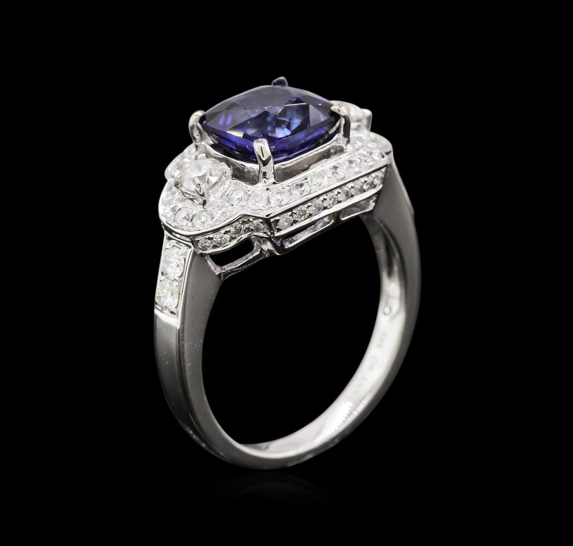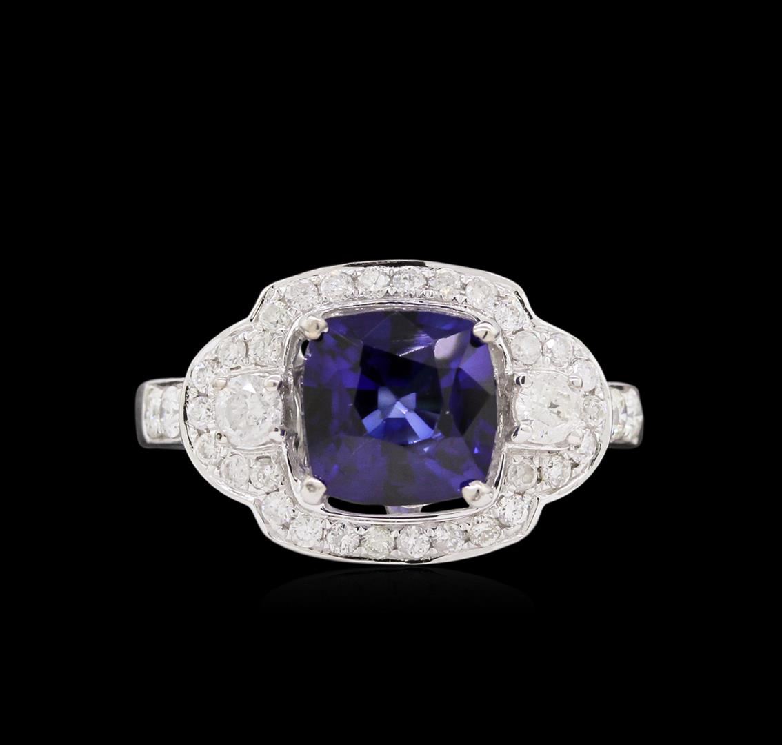 One electronically tested 14KT white gold ladies cast sapphire and diamond ring with a bright polish finish. Identified with markings of "14K". Condition is new. Containing: One prong set square cushion modified brilliant cut natural blue sapphire, measuring 7.50 x 7.50 x 4.88mm, approximate weight of 2.58ct., clarity is eye clean, type II, medium, moderately strong, blue color, (GIA B 5/4), cut is good. Two prong set round brilliant cut diamonds, measuring 2.90 - 2.90 x 1.74mm (depth est.) approximate total weight of 2 Stones = 0.18ct. Clarity: I-2. Color: H. Sixty-Seven prong set round brilliant cut diamonds, measuring 1.80 - 1.30 x 0.93mm (depth est.) approximate total weight of 67 Stones = 0.80ct. Clarity: SI-2 to I-1. Color: H - I. Colored gemstones are presumed to have been subjected to commonly used enhancement processes. All diamonds and colored gemstones are graded in the mounting, unless otherwise stated. Total Weight of Colored Stones 2.58ct. Total Weight of Diamonds 0.98ct. Total Weight of Ring 5.50 grams. GGL Appraised at $5,600.00.