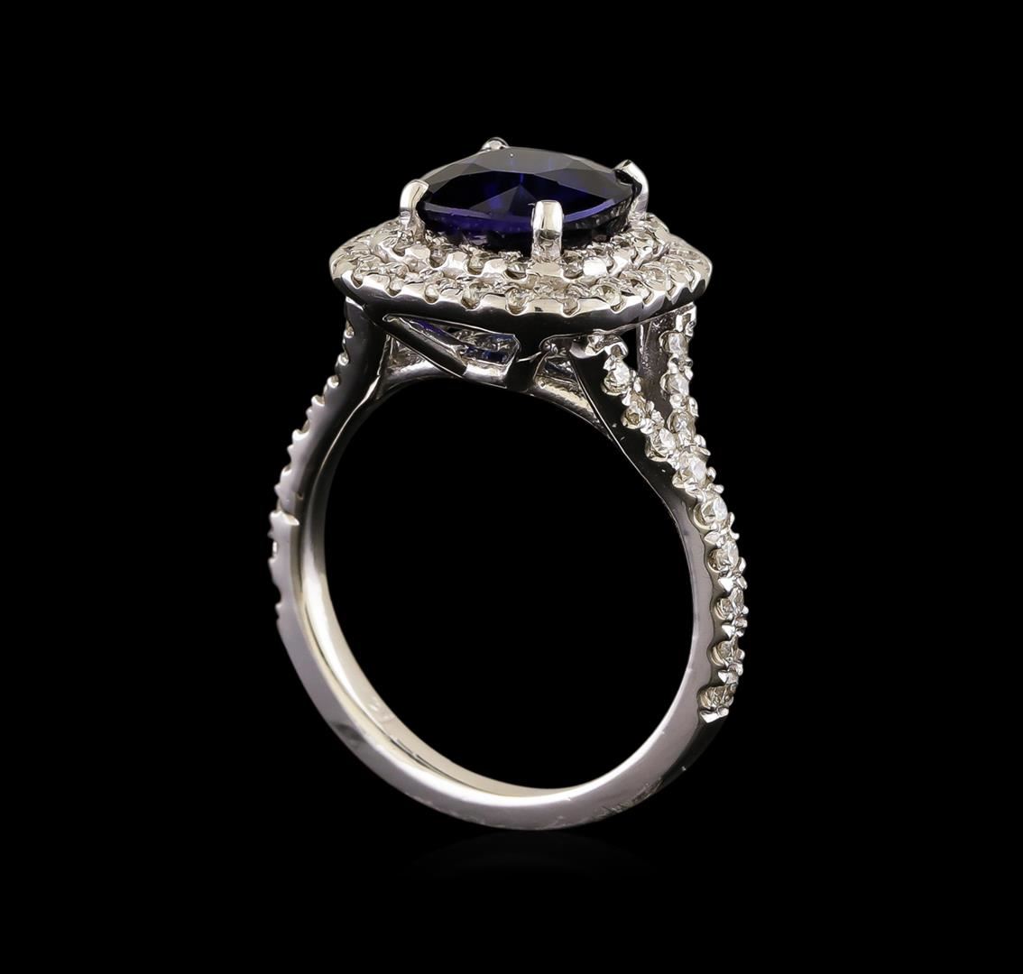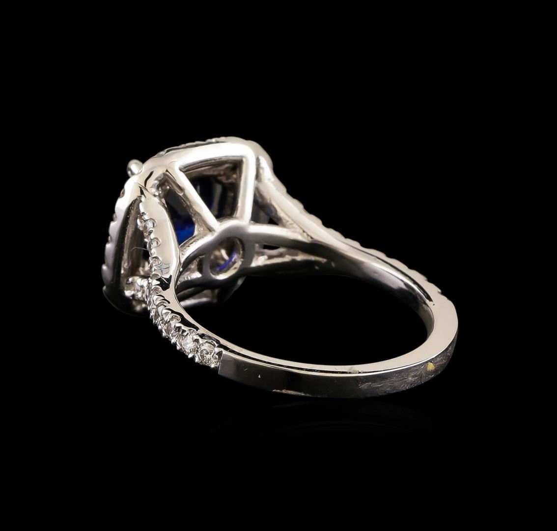 One electronically tested 14KT white gold ladies cast sapphire and diamond ring with a bright polish finish. The featured sapphire is set within two tiered diamond bezels supported by diamond set split Identified with markings of "14K". Condition is new, excellent workmanship. Containing: One prong set square cushion mixed cut blue sapphire, measuring 7.60 x 7.60 x 4.50mm, 6% bulge factor, approximate weight of 2.59ct., clarity is eye clean, type II, dark, very slightly grayish, very slightly greenish blue color, (GIA vslgB 7/3), cut is good. Transmitting light with no distortion, transparent. Indications of laboratory high temperature diffusion treatment. Graded in the setting. Whether or not this gemstone is natural cannot currently be determined due to diffusion treatment. Sixty-Six prong set round brilliant cut diamonds, measuring 1.50 - 1.30 x 0.84mm (depth est.) approximate total weight of 66 Stones = 0.76ct. Graded in the setting. Clarity: SI-1 to I-1. Color: G - I. Total Weight of Colored Stones 2.59ct. Total Weight of Diamonds 0.76ct. Total Weight of Ring 5.32 grams. AIG Appraised at $3,255.00.