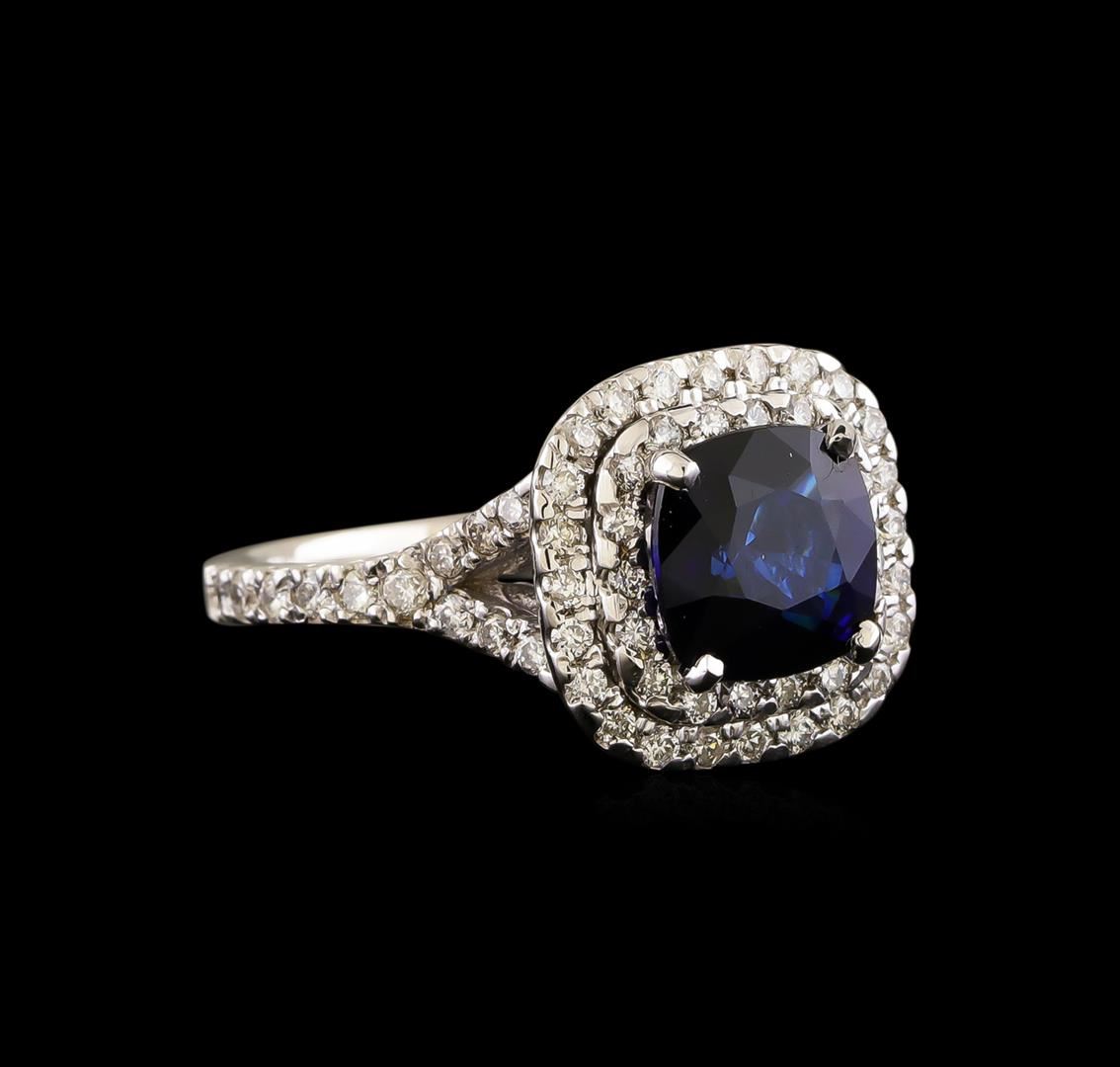 One electronically tested 14KT white gold ladies cast sapphire and diamond ring with a bright polish finish. The featured sapphire is set within two tiered diamond bezels supported by diamond set split Identified with markings of "14K". Condition is new, excellent workmanship. Containing: One prong set square cushion mixed cut blue sapphire, measuring 7.60 x 7.60 x 4.50mm, 6% bulge factor, approximate weight of 2.59ct., clarity is eye clean, type II, dark, very slightly grayish, very slightly greenish blue color, (GIA vslgB 7/3), cut is good. Transmitting light with no distortion, transparent. Indications of laboratory high temperature diffusion treatment. Graded in the setting. Whether or not this gemstone is natural cannot currently be determined due to diffusion treatment. Sixty-Six prong set round brilliant cut diamonds, measuring 1.50 - 1.30 x 0.84mm (depth est.) approximate total weight of 66 Stones = 0.76ct. Graded in the setting. Clarity: SI-1 to I-1. Color: G - I. Total Weight of Colored Stones 2.59ct. Total Weight of Diamonds 0.76ct. Total Weight of Ring 5.32 grams. AIG Appraised at $3,255.00.