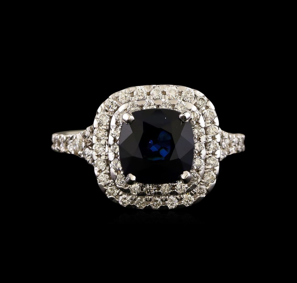 One electronically tested 14KT white gold ladies cast sapphire and diamond ring with a bright polish finish. The featured sapphire is set within two tiered diamond bezels supported by diamond set split Identified with markings of "14K". Condition is new, excellent workmanship. Containing: One prong set square cushion mixed cut blue sapphire, measuring 7.60 x 7.60 x 4.50mm, 6% bulge factor, approximate weight of 2.59ct., clarity is eye clean, type II, dark, very slightly grayish, very slightly greenish blue color, (GIA vslgB 7/3), cut is good. Transmitting light with no distortion, transparent. Indications of laboratory high temperature diffusion treatment. Graded in the setting. Whether or not this gemstone is natural cannot currently be determined due to diffusion treatment. Sixty-Six prong set round brilliant cut diamonds, measuring 1.50 - 1.30 x 0.84mm (depth est.) approximate total weight of 66 Stones = 0.76ct. Graded in the setting. Clarity: SI-1 to I-1. Color: G - I. Total Weight of Colored Stones 2.59ct. Total Weight of Diamonds 0.76ct. Total Weight of Ring 5.32 grams. AIG Appraised at $3,255.00.