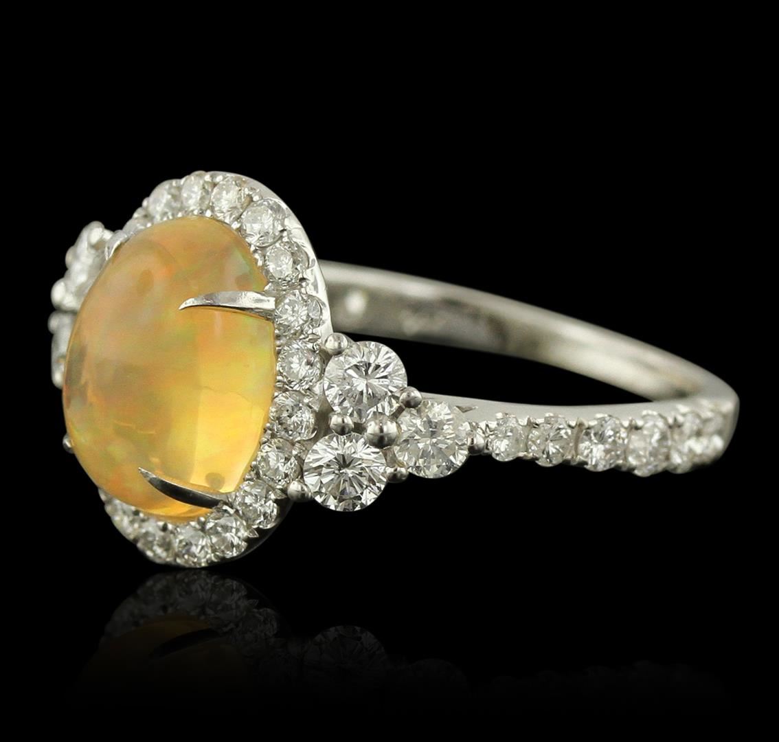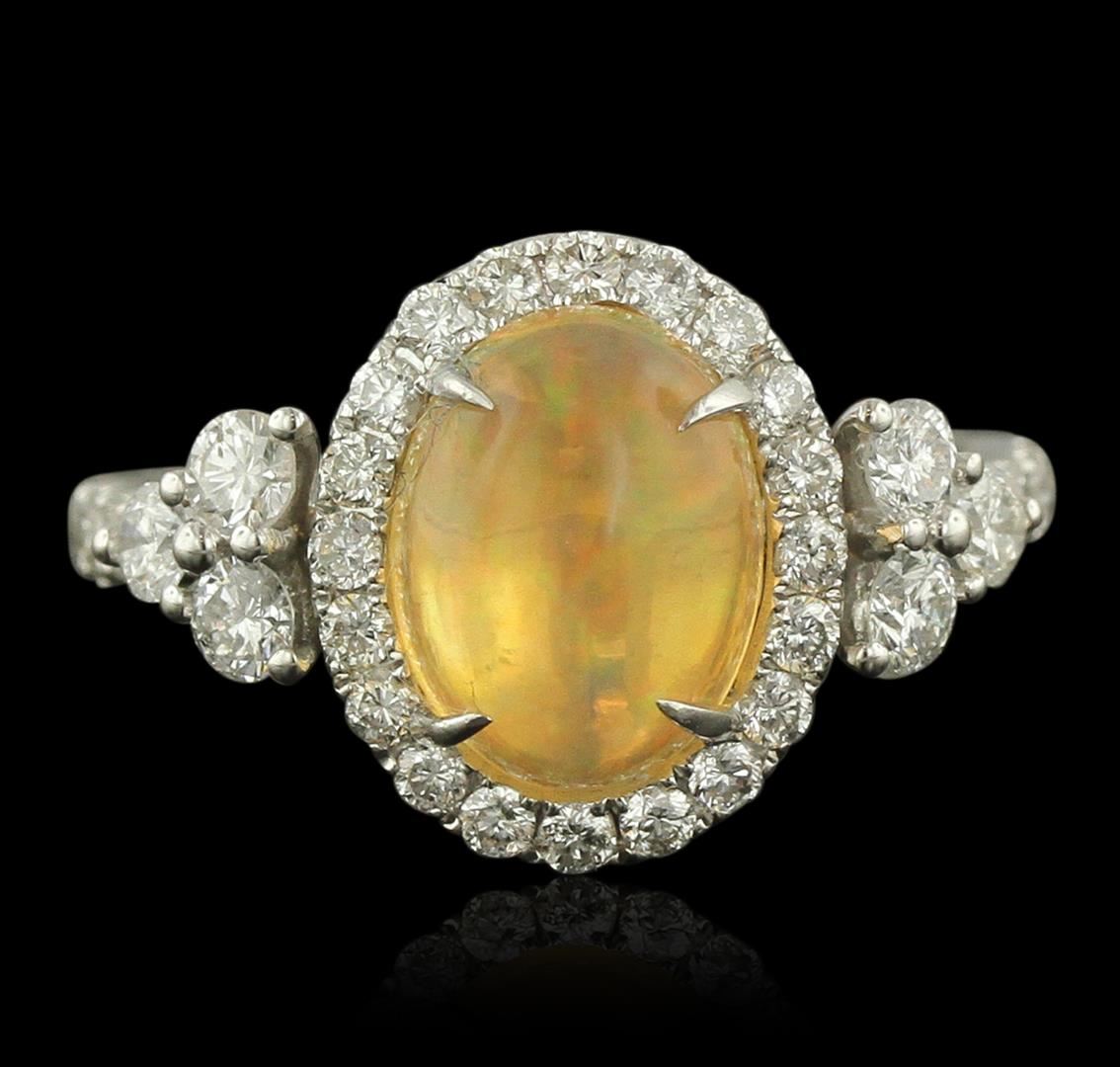 One electronically tested 14KT white gold ladies cast & assembled Ethiopian opal & diamond ring with a bright polish finish. Condition is new, good workmanship. The featured opal is set within a diamond bezel supported by diamond set shoulders, completed by a one and one-half millimeter wide band. Identified with markings of "14K 585". Containing: One crystal opal that is cut in a oval shaped cabochon and is prong set, measuring 10.00 mm long x 8.00 mm wide, and 4.85 mm thick and the approximate weight is 2.59 carats. The opal has a bright, orange-green play of color (fire) in a flashfire pattern; a high dome; a good cut; no inclusions; slight variation in base in its brightness and pattern; and is slightly directional. Graded in the setting. Six prong set round brilliant cut diamonds, measuring 2.70 - 2.60 x 1.59mm (depth est.) approximate. Total Weight of 6 Stones = 0.50ct. Graded in the setting. Clarity: SI-1 to SI-2. Color: G - H Six prong set round brilliant cut diamonds, measuring 2.10 - 2.00 x 1.23mm (depth est.) approximate. Total Weight of 6 Stones = 0.25ct. Graded in the setting. Clarity: SI-1 to SI-2. Color: G - H Twenty-Six prong set round brilliant cut diamonds, measuring 1.70 - 1.60 x 0.99mm (depth est.) approximate. Total Weight of 26 Stones = 0.52ct. Graded in the setting. Clarity: SI-1 to I-1. Color: G - I. Total Weight of Diamonds 1.27ct. Total Weight of Opals 2.59ct. Total Weight of Ring 3.46 grams. AIG Appraised at $4,950.00.