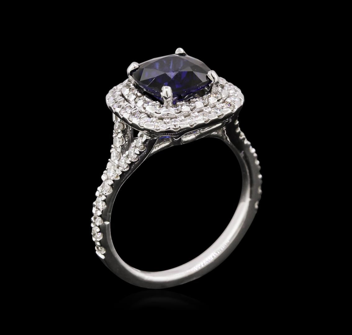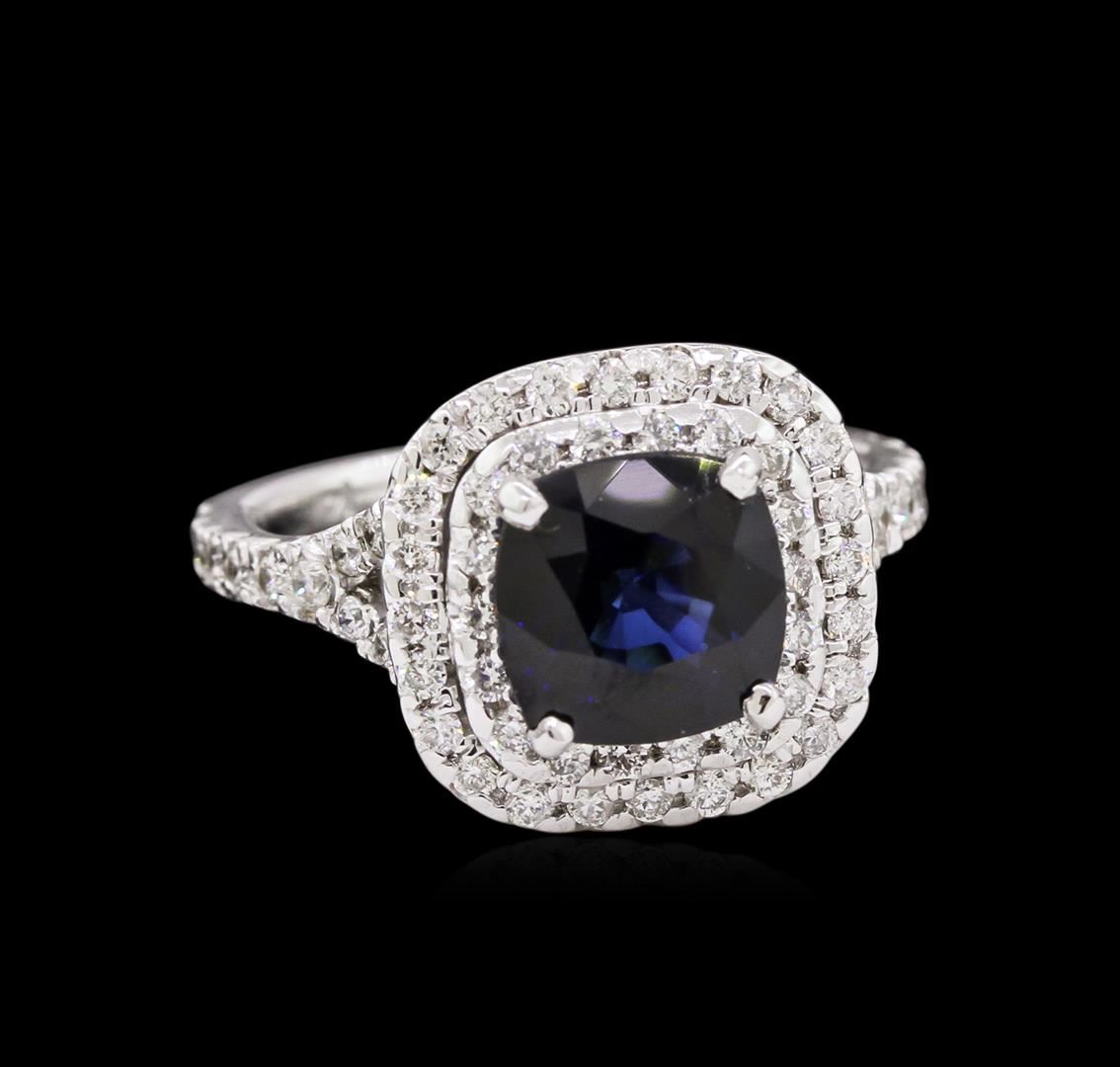 One electronically tested 14KT white gold ladies cast sapphire and diamond ring with a bright polish finish. The featured sapphire is set within two tiered diamond bezels supported by diamond set split Identified with markings of "14K". Condition is new, excellent workmanship. Containing: One prong set square cushion mixed cut blue sapphire, measuring 7.60 x 7.60 x 4.50mm, 6% bulge factor, approximate weight of 2.59ct., clarity is eye clean, type II, dark, very slightly grayish, very slightly greenish blue color, (GIA vslgB 7/3), cut is good. Transmitting light with no distortion, transparent. Indications of laboratory high temperature diffusion treatment. Graded in the setting. Whether or not this gemstone is natural cannot currently be determined due to diffusion treatment. Sixty-Six prong set round brilliant cut diamonds, measuring 1.50 - 1.30 x 0.84mm (depth est.) approximate total weight of 66 Stones = 0.76ct. Graded in the setting. Clarity: SI-1 to I-1. Color: G - I. Total Weight of Colored Stones 2.59ct. Total Weight of Diamonds 0.76ct. Total Weight of Ring 5.32 grams. AIG Appraised at $3,255.00.