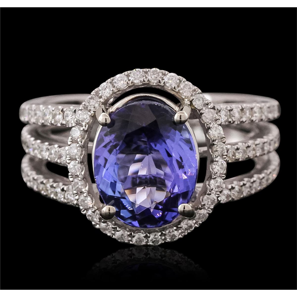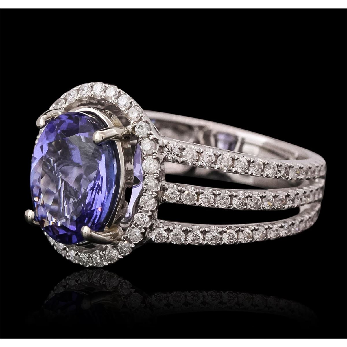 One electronically tested 14KT white gold ladies cast tanzanite & diamond ring with a bright finish. The featured tanzanite is set within an inner white gold basket and an outer diamond set bezel, supported by an elaborate white gold under gallery and diamond set set shoulders, completed by a four and one half millimeter wide band. Identified with markings of "14K". Condition is new, good workmanship. Containing: One prong set oval mixed cut natural tanzanite, measuring 10.10 x 8.10 x 4.50mm, 4% bulge factor, approximate weight of 2.60ct., clarity is eye clean, type I, medium dark, very slightly grayish, violetish blue color, (GIA vB 6/3), cut is good. Transmitting light with no distortion, transparent. Graded in the setting. Tanzanite is a very rare gemstone that is only found in the country of Tanzania. Tanzanite was originally discovered in 1967. Tiffany & Company, named the stone "Tanzanite" after the country of origin. Tanzanite is found in the Usumburu Mountains that border the Umba Valley of northern Tanzania. This region is inhabited by the Masai tribes-people. The mining area is located just south of the Kenya border near Mt. Kilimanjaro. Tanzanite occurs in colors of gray, brown, violet, blue, reddish-purple, & green. The gem is interesting because of its exceptional pleochroism. Rotated in different directions a tanzanite will exhibit multiple changes of color. Tanzanite has a low tolerance to ultrasonic cleaning, and should not be cleaned using this method. One Hundred Six prong set round brilliant cut diamonds, measuring 1.30 - 1.30 x 0.79mm (depth est.) approximate total weight of 106 Stones = 0.86ct. Graded in the setting. Clarity: I-1 to I-2. Color: H - I. Total Weight of Colored Stones 2.60ct. Total Weight of Diamonds 0.86ct. Total Weight of Ring 5.31 grams. AIG Appraised at $9,050.00.
