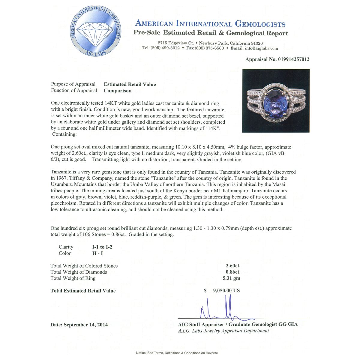 One electronically tested 14KT white gold ladies cast tanzanite & diamond ring with a bright finish. The featured tanzanite is set within an inner white gold basket and an outer diamond set bezel, supported by an elaborate white gold under gallery and diamond set set shoulders, completed by a four and one half millimeter wide band. Identified with markings of "14K". Condition is new, good workmanship. Containing: One prong set oval mixed cut natural tanzanite, measuring 10.10 x 8.10 x 4.50mm, 4% bulge factor, approximate weight of 2.60ct., clarity is eye clean, type I, medium dark, very slightly grayish, violetish blue color, (GIA vB 6/3), cut is good. Transmitting light with no distortion, transparent. Graded in the setting. Tanzanite is a very rare gemstone that is only found in the country of Tanzania. Tanzanite was originally discovered in 1967. Tiffany & Company, named the stone "Tanzanite" after the country of origin. Tanzanite is found in the Usumburu Mountains that border the Umba Valley of northern Tanzania. This region is inhabited by the Masai tribes-people. The mining area is located just south of the Kenya border near Mt. Kilimanjaro. Tanzanite occurs in colors of gray, brown, violet, blue, reddish-purple, & green. The gem is interesting because of its exceptional pleochroism. Rotated in different directions a tanzanite will exhibit multiple changes of color. Tanzanite has a low tolerance to ultrasonic cleaning, and should not be cleaned using this method. One Hundred Six prong set round brilliant cut diamonds, measuring 1.30 - 1.30 x 0.79mm (depth est.) approximate total weight of 106 Stones = 0.86ct. Graded in the setting. Clarity: I-1 to I-2. Color: H - I. Total Weight of Colored Stones 2.60ct. Total Weight of Diamonds 0.86ct. Total Weight of Ring 5.31 grams. AIG Appraised at $9,050.00.