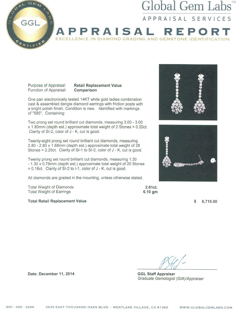 One pair electronically tested 14KT white gold ladies combination cast & assembled dangle diamond earrings with friction posts with a bright polish finish. Identified with markings of "585". Condition is new. Containing: Two prong set round brilliant cut diamonds, measuring 3.00 - 3.00 x 1.80mm (depth est.) approximate total weight of 2 Stones = 0.20ct. Clarity: SI-2. Color: J - K, Cut is Good. Twenty-Eight prong set round brilliant cut diamonds, measuring 2.80 - 2.80 x 1.68mm (depth est.) approximate total weight of 28 Stones = 2.25ct. Clarity: SI-1 to SI-2. Color: J - K, Cut is Good. Twenty prong set round brilliant cut diamonds, measuring 1.30 - 1.30 x 0.78mm (depth est.) approximate total weight of 20 Stones = 0.16ct. Clarity: SI-2 to I-1. Color: J - K, Cut is Good. All diamonds are graded in the mounting, unless otherwise stated. Total Weight of Diamonds 2.61ct. Total Weight of Earrings 6.10 grams. GGL Appraised at $6,710.00.