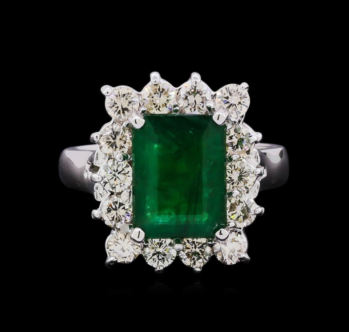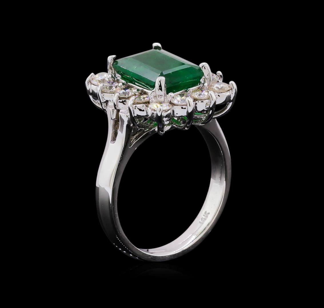 One electronically tested 14KT white gold ladies cast emerald and diamond ring with a bright polish finish. Condition is new, good workmanship. The featured emerald is set within a diamond bezel, supported by split shoulders and completed by a three millimeter wide band. Identified with markings of "14K". Containing: One prong set rectangular step cut natural emerald, measuring 10.20 x 7.70 x 4.10mm, approximate weight of 2.61ct., clarity is heavily included, type III, medium, very slightly grayish, very slightly bluish green color, (GIA vslbG 5/3), cut is good. Transmitting light with a minimum of distortion, transparent to translucent. Naturally occurring internal & external characteristics are present. Indications of oil, & opticon residue. Graded in the setting. Fourteen prong set round brilliant cut diamonds, measuring 2.80 - 2.80 x 1.68mm (depth est.) approximate total weight of 14 Stones = 1.17ct. Graded in the setting. Clarity SI-2 to I-1. Color G -- I. Total Weight of Colored Stones 2.61ct. Total Weight of Diamonds 1.17ct. Total Weight of Ring 6.10gm. AIG Appraised at $6,425.00.