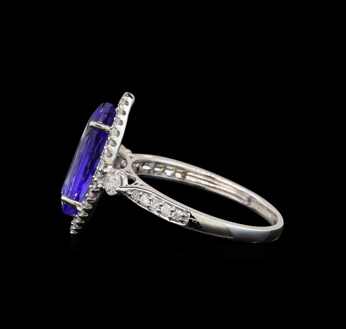 One electronically tested 14KT white gold ladies cast tanzanite and diamond ring with a half round shank with a bright polish finish. Trademark is Orianne. Identified with markings of "14K". Condition is new. Containing: One prong set marquise modified brilliant cut natural tanzanite, measuring 14.19 x 6.89 x 4.20mm, approximate weight of 2.61ct., clarity is eye clean, type I, medium light, very slightly grayish, violet color, (GIA V 4/3), cut is good. Forty-Two prong set round brilliant cut diamonds, measuring 1.20 - 1.20 x 0.72mm (depth est.) approximate total weight of 42 Stones = 0.27ct. Clarity: SI-2 to I-2. Color: I - J. Two prong set round brilliant cut diamonds, measuring 2.50 - 2.50 x 1.50mm (depth est.) approximate total weight of 2 Stones = 0.11ct. Clarity: I-1 to I-2. Color: I - J. All diamonds and colored gemstones are graded in the mounting, unless otherwise stated. Colored gemstones are presumed to have been subjected to commonly used enhancement processes. Total Weight of Colored Stones 2.61ct. Total Weight of Diamonds 0.38ct. Total Weight of Ring 3.10 grams. GGL Appraised at $4,170.00.