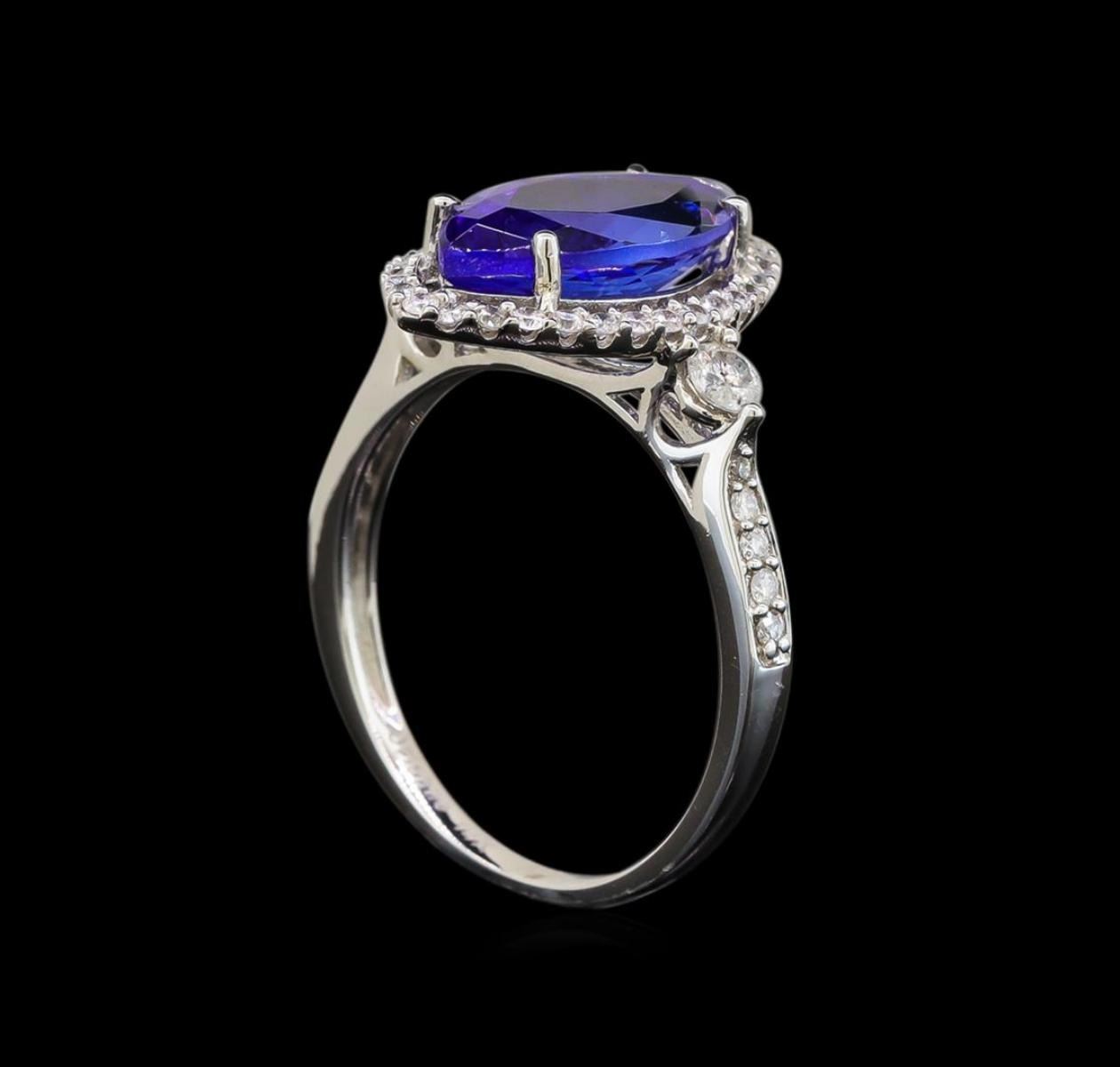 One electronically tested 14KT white gold ladies cast tanzanite and diamond ring with a half round shank with a bright polish finish. Trademark is Orianne. Identified with markings of "14K". Condition is new. Containing: One prong set marquise modified brilliant cut natural tanzanite, measuring 14.19 x 6.89 x 4.20mm, approximate weight of 2.61ct., clarity is eye clean, type I, medium light, very slightly grayish, violet color, (GIA V 4/3), cut is good. Forty-Two prong set round brilliant cut diamonds, measuring 1.20 - 1.20 x 0.72mm (depth est.) approximate total weight of 42 Stones = 0.27ct. Clarity: SI-2 to I-2. Color: I - J. Two prong set round brilliant cut diamonds, measuring 2.50 - 2.50 x 1.50mm (depth est.) approximate total weight of 2 Stones = 0.11ct. Clarity: I-1 to I-2. Color: I - J. All diamonds and colored gemstones are graded in the mounting, unless otherwise stated. Colored gemstones are presumed to have been subjected to commonly used enhancement processes. Total Weight of Colored Stones 2.61ct. Total Weight of Diamonds 0.38ct. Total Weight of Ring 3.10 grams. GGL Appraised.