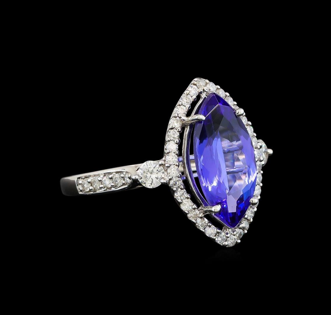 One electronically tested 14KT white gold ladies cast tanzanite and diamond ring with a half round shank with a bright polish finish. Trademark is Orianne. Identified with markings of "14K". Condition is new. Containing: One prong set marquise modified brilliant cut natural tanzanite, measuring 14.19 x 6.89 x 4.20mm, approximate weight of 2.61ct., clarity is eye clean, type I, medium light, very slightly grayish, violet color, (GIA V 4/3), cut is good. Forty-Two prong set round brilliant cut diamonds, measuring 1.20 - 1.20 x 0.72mm (depth est.) approximate total weight of 42 Stones = 0.27ct. Clarity: SI-2 to I-2. Color: I - J. Two prong set round brilliant cut diamonds, measuring 2.50 - 2.50 x 1.50mm (depth est.) approximate total weight of 2 Stones = 0.11ct. Clarity: I-1 to I-2. Color: I - J. All diamonds and colored gemstones are graded in the mounting, unless otherwise stated. Colored gemstones are presumed to have been subjected to commonly used enhancement processes. Total Weight of Colored Stones 2.61ct. Total Weight of Diamonds 0.38ct. Total Weight of Ring 3.10 grams. GGL Appraised.