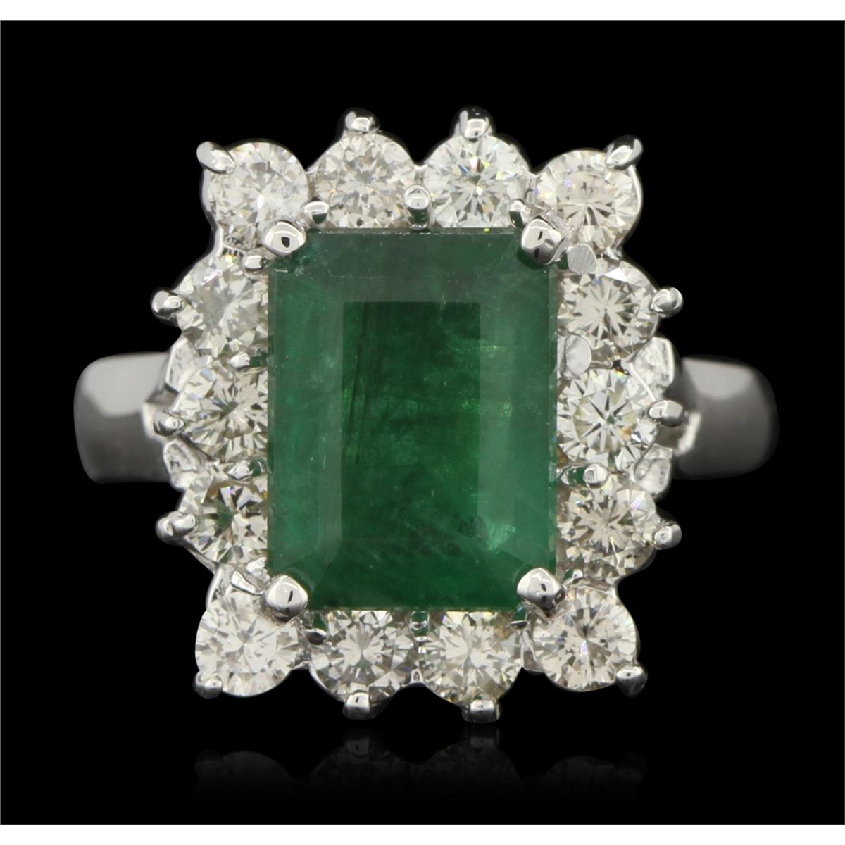 One electronically tested 14KT white gold ladies cast emerald and diamond ring with a bright polish finish. Condition is new, good workmanship. The featured emerald is set within a diamond bezel, supported by split shoulders and completed by a three millimeter wide band. Identified with markings of "14K". Containing: One prong set rectangular step cut natural emerald, measuring 10.20 x 7.70 x 4.10mm, approximate weight of 2.61ct., clarity is heavily included, type III, medium, very slightly grayish, very slightly bluish green color, (GIA vslbG 5/3), cut is good. Transmitting light with a minimum of distortion, transparent to translucent. Naturally occurring internal & external characteristics are present. Indications of oil, & opticon residue. Graded in the setting. Fourteen prong set round brilliant cut diamonds, measuring 2.80 - 2.80 x 1.68mm (depth est.) approximate total weight of 14 Stones = 1.17ct. Graded in the setting. Clarity SI-2 to I-1. Color G - I. Total Weight of Colored Stones 2.61ct. Total Weight of Diamonds 1.17ct. Total Weight of Ring 6.10gm. AIG Appraised at $6,425.00.