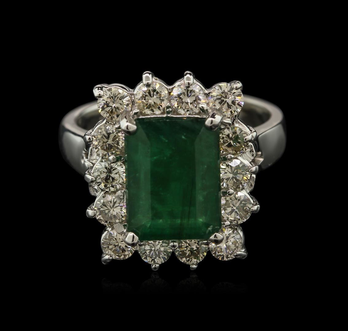One electronically tested 14KT white gold ladies cast emerald and diamond ring with a bright polish finish. Condition is new, good workmanship. The featured emerald is set within a diamond bezel, supported by split shoulders and completed by a three millimeter wide band. Identified with markings of "14K". Containing: One prong set rectangular step cut natural emerald, measuring 10.20 x 7.70 x 4.10mm, approximate weight of 2.61ct., clarity is heavily included, type III, medium, very slightly grayish, very slightly bluish green color, (GIA vslbG 5/3), cut is good. Transmitting light with a minimum of distortion, transparent to translucent. Naturally occurring internal & external characteristics are present. Indications of oil, & opticon residue. Graded in the setting. Fourteen prong set round brilliant cut diamonds, measuring 2.80 - 2.80 x 1.68mm (depth est.) approximate total weight of 14 Stones = 1.17ct. Graded in the setting. Clarity SI-2 to I-1. Color G -- I. Total Weight of Colored Stones 2.61ct. Total Weight of Diamonds 1.17ct. Total Weight of Ring 6.10gm. AIG Appraised at $6,425.00.