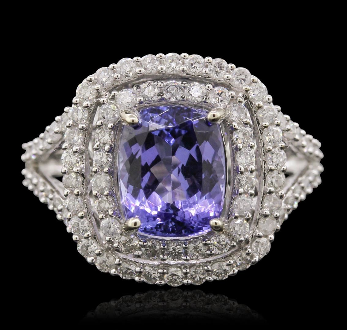 One electronically tested 14KT white gold Ladies cast ring with a bright polish finish. Condition is new. Identified with markings of "14K". Containing: One prong set rectangular cushion modified brilliant cut natural tanzanite, measuring 9.00 x 7.00 x 4.90mm, approximate weight of 2.61ct., clarity is eye clean, type I, medium, very slightly grayish, bluish violet color, (GIA bV 5/3), cut is very good. Colored gemstones are presumed to have been subjected to commonly used color/clarity enhancement processes. Seventy-Six prong set round brilliant cut diamonds, measuring 1.50 - 1.50 x 0.90mm (depth est.) approximate. Total Weight of 76 Stones = 0.88ct. Clarity: I-1. Color: H - I, Cut is Good. Total Weight of Colored Stones 2.61ct. Total Weight of Diamonds 0.88ct. Total Weight of Ring 4.50 grams. GGL Appraised at $6,980.00.