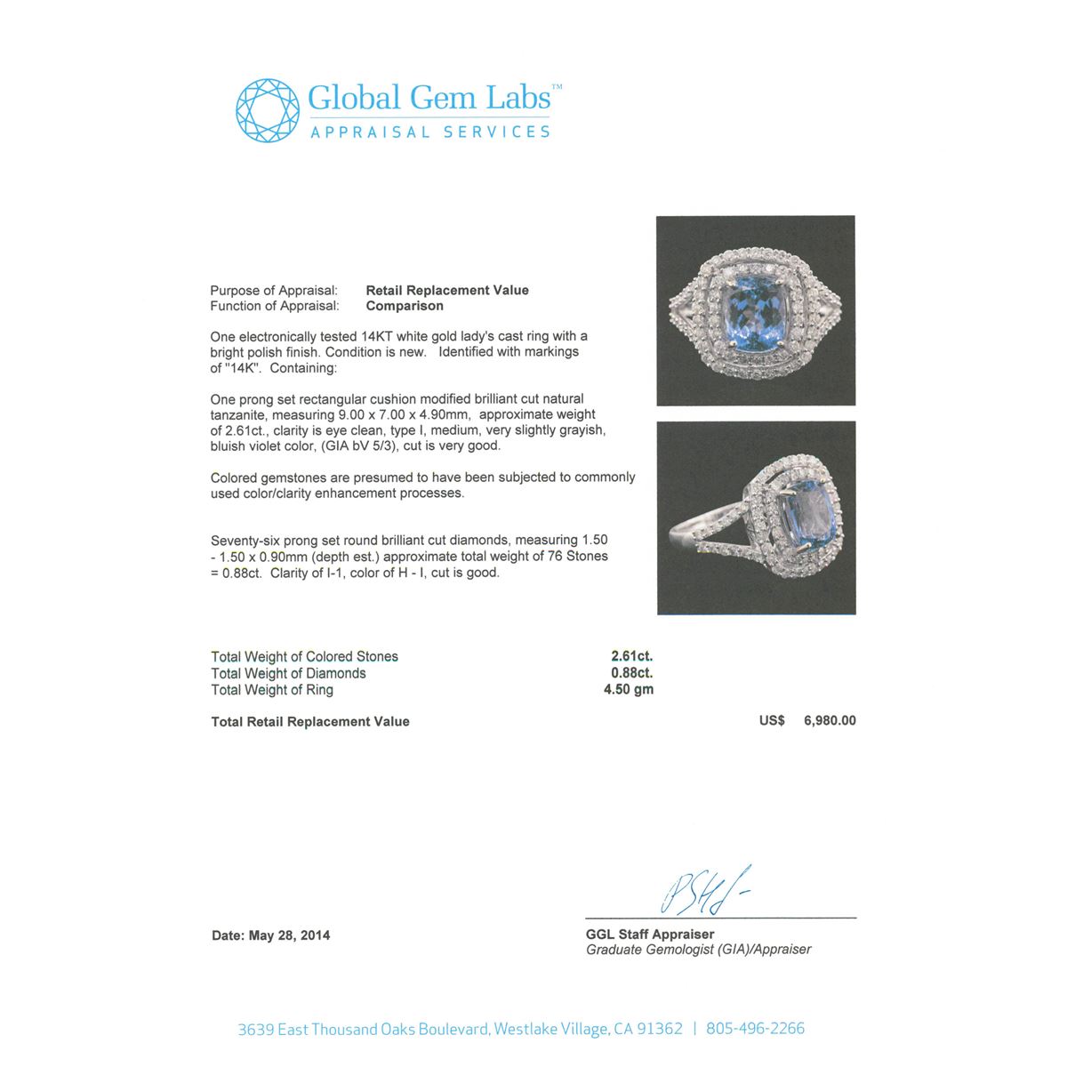 One electronically tested 14KT white gold Ladies cast ring with a bright polish finish. Condition is new. Identified with markings of "14K". Containing: One prong set rectangular cushion modified brilliant cut natural tanzanite, measuring 9.00 x 7.00 x 4.90mm, approximate weight of 2.61ct., clarity is eye clean, type I, medium, very slightly grayish, bluish violet color, (GIA bV 5/3), cut is very good. Colored gemstones are presumed to have been subjected to commonly used color/clarity enhancement processes. Seventy-Six prong set round brilliant cut diamonds, measuring 1.50 - 1.50 x 0.90mm (depth est.) approximate. Total Weight of 76 Stones = 0.88ct. Clarity: I-1. Color: H - I, Cut is Good. Total Weight of Colored Stones 2.61ct. Total Weight of Diamonds 0.88ct. Total Weight of Ring 4.50 grams. GGL Appraised at $6,980.00.
