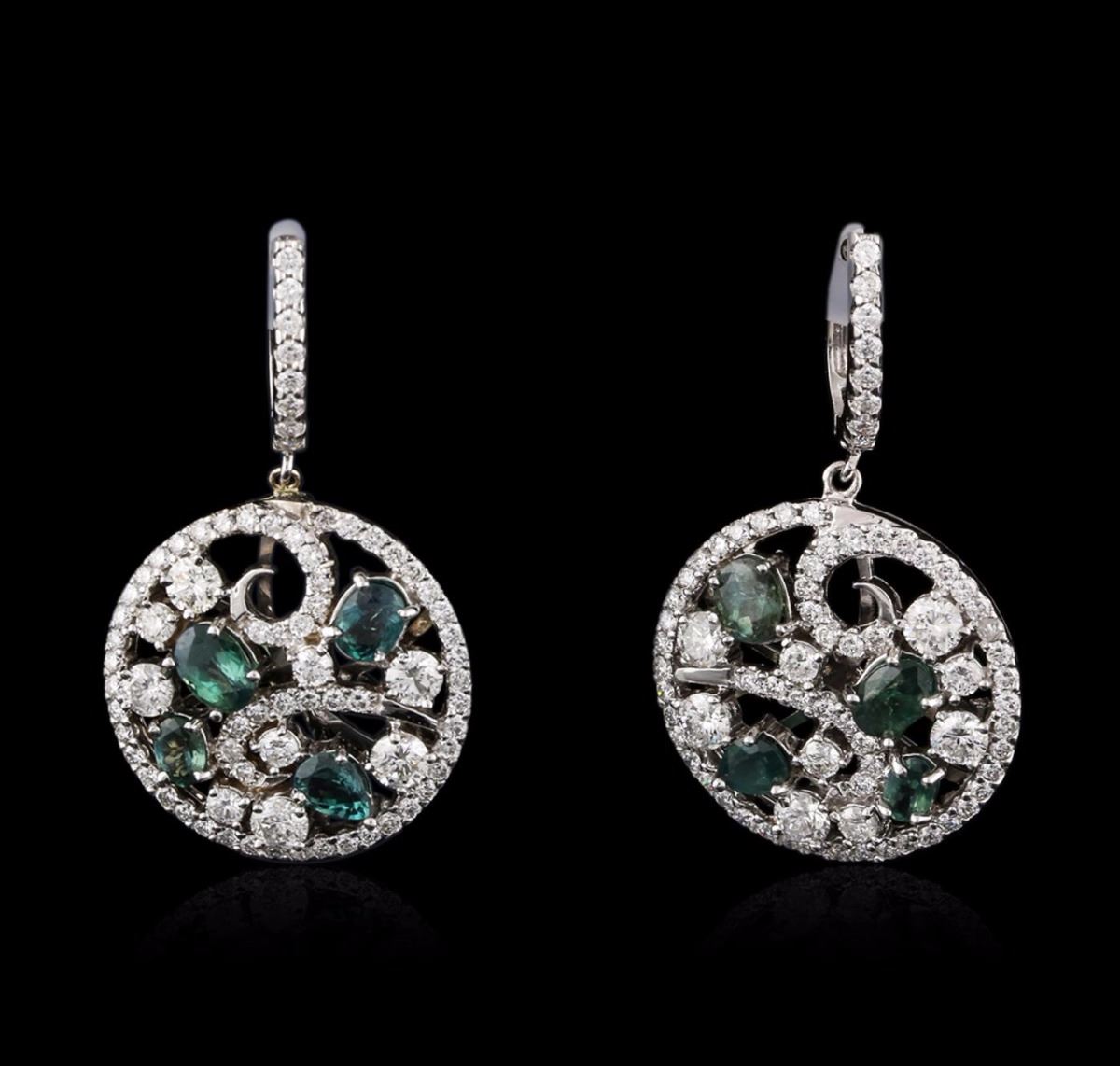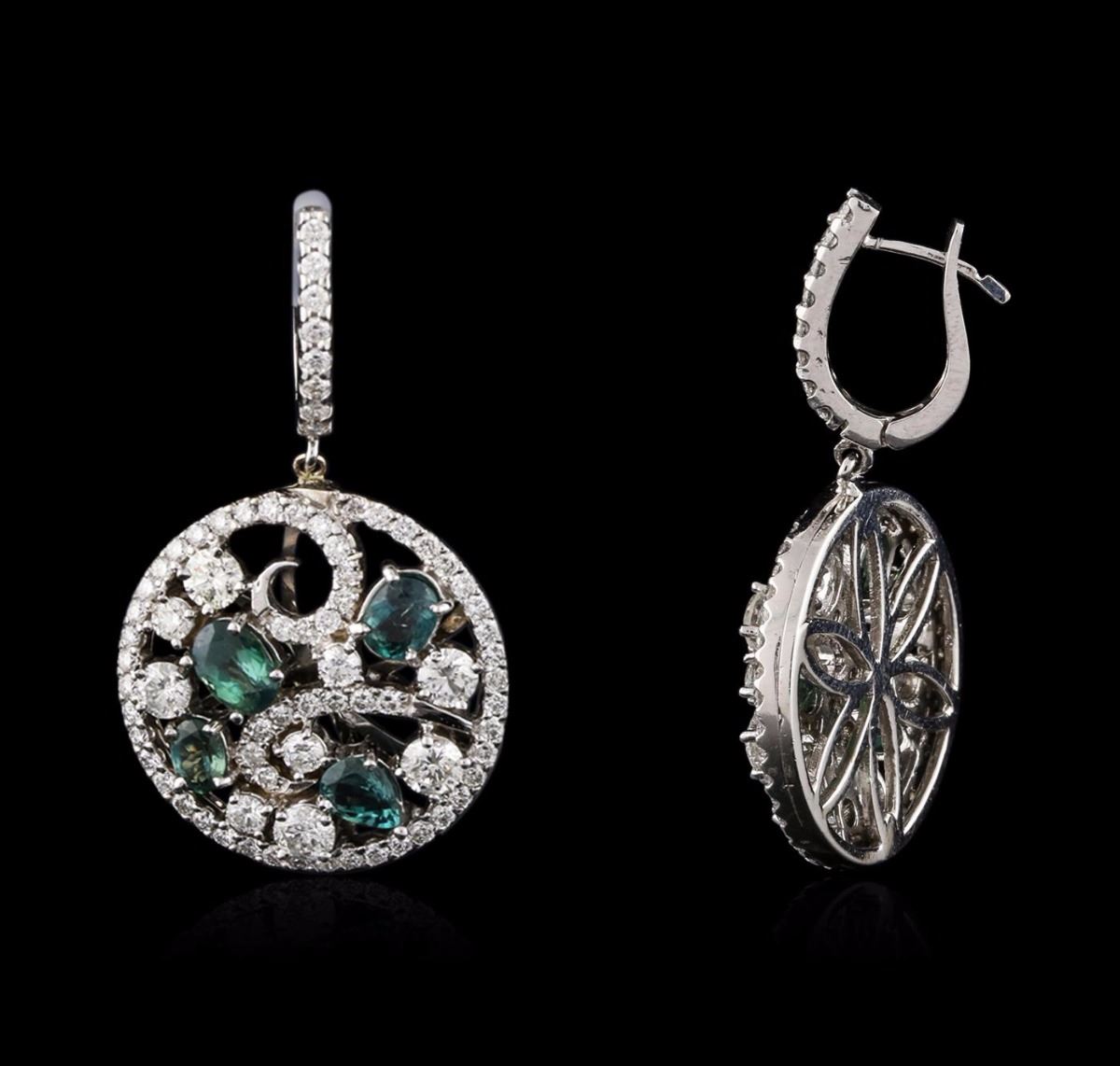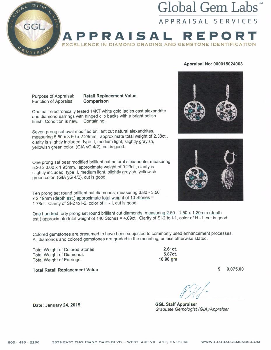 One pair electronically tested 14KT white gold ladies cast alexandrite and diamond earrings with hinged clip backs with a bright polish finish. Condition is new. Containing: Seven prong set oval modified brilliant cut natural alexandrites, measuring 5.50 x 3.50 x 2.28mm, approximate total weight of 2.38ct., clarity is slightly included, type II, medium light, slightly grayish, yellowish green color, (GIA yG 4/2), cut is good. One prong set pear modified brilliant cut natural alexandrite, measuring 5.20 x 3.00. x 1.95mm, approximate weight of 0.23ct., clarity is slightly included, type II, medium light, slightly grayish, yellowish green color, (GIA yG 4/2), cut is good. Ten prong set round brilliant cut diamonds, measuring 3.80 - 3.50 x 2.19mm (depth est.) approximate total weight of 10 Stones = 1.78ct. Clarity: SI-2 to I-2. Color: H - I, Cut is Good. One Hundred Forty prong set round brilliant cut diamonds, measuring 2.50 - 1.50 x 1.20mm (depth est.) approximate total weight of 140 Stones = 4.09ct. Clarity: SI-2 to I-1. Color: H - I, Cut is Good. Colored gemstones are presumed to have been subjected to commonly used enhancement processes. All diamonds and colored gemstones are graded in the mounting, unless otherwise stated. Total Weight of Colored Stones 2.61ct. Total Weight of Diamonds 5.87ct. Total Weight of Earrings 16.90 grams. GGL Appraised at $9,075.00.