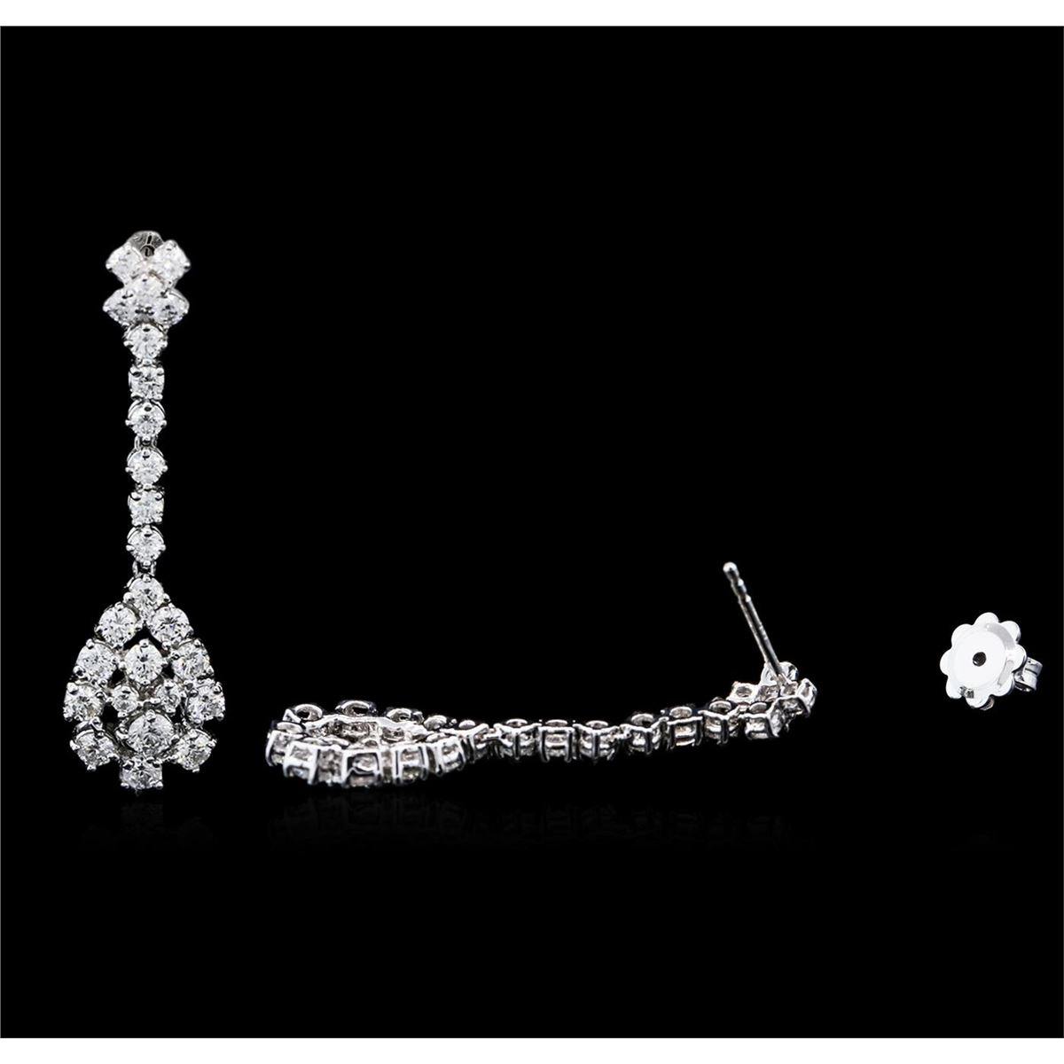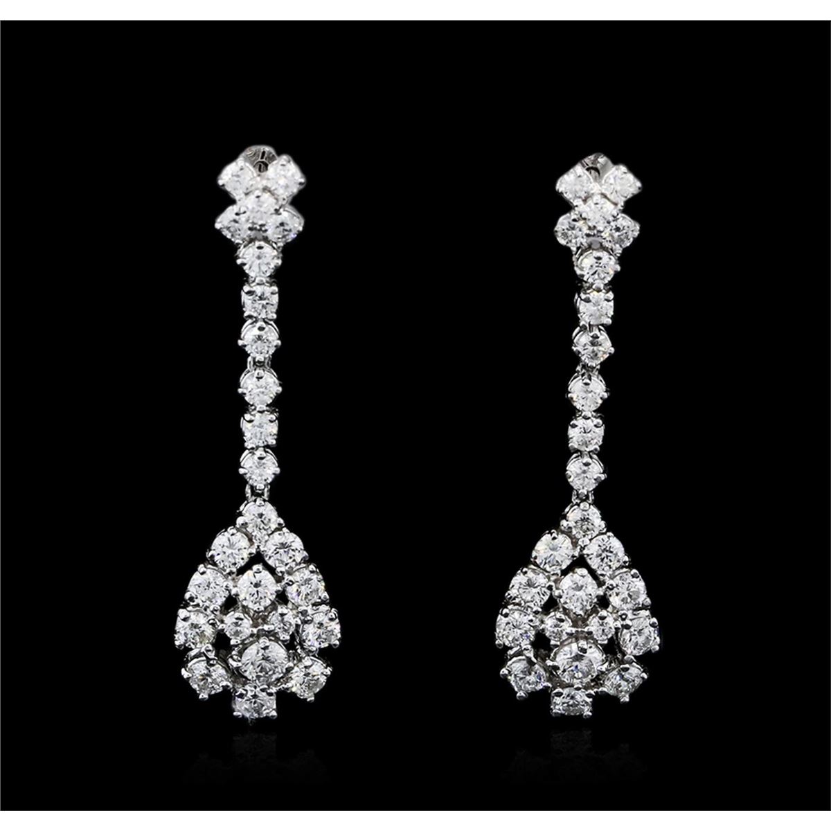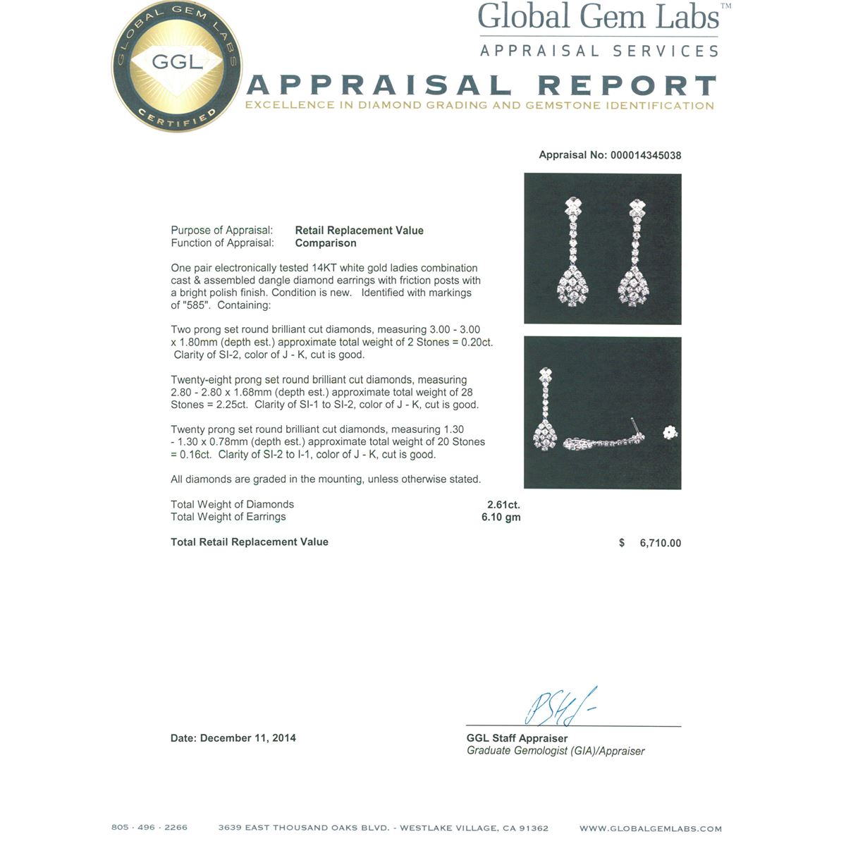 One pair electronically tested 14KT white gold ladies combination cast & assembled dangle diamond earrings with friction posts with a bright polish finish. Identified with markings of "585". Condition is new. Containing: Two prong set round brilliant cut diamonds, measuring 3.00 - 3.00 x 1.80mm (depth est.) approximate total weight of 2 Stones = 0.20ct. Clarity: SI-2. Color: J - K, Cut is Good. Twenty-Eight prong set round brilliant cut diamonds, measuring 2.80 - 2.80 x 1.68mm (depth est.) approximate total weight of 28 Stones = 2.25ct. Clarity: SI-1 to SI-2. Color: J - K, Cut is Good. Twenty prong set round brilliant cut diamonds, measuring 1.30 - 1.30 x 0.78mm (depth est.) approximate total weight of 20 Stones = 0.16ct. Clarity: SI-2 to I-1. Color: J - K, Cut is Good. All diamonds are graded in the mounting, unless otherwise stated. Total Weight of Diamonds 2.61ct. Total Weight of Earrings 6.10 grams. GGL Appraised at $6,710.00.