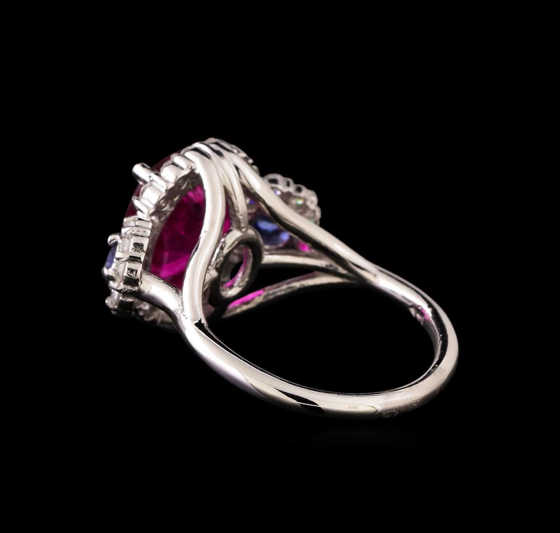 One electronically tested 14KT white gold ladies combination cast & assembled tourmaline, sapphire & diamond Ring with a half round shank with a bright polish finish. Identified with markings of "14K". Condition is new. Containing: One prong set oval modified brilliant cut natural pink tourmaline, measuring 11.20 x 7.91 x 4.60mm, approximate weight of 2.62ct., clarity is moderately included, type II, medium, moderately strong, purple red color, (GIA PR 5/4), cut is good. Two prong set round modified brilliant cut natural blue sapphires, measuring 3.20 - 3.20 x 2.08 mm, approximate total weight of 0.34ct., clarity is slightly included, type II, medium dark, moderately strong, blue color, (GIA B 6/4), cut is good. Thirty prong set round brilliant cut diamonds, measuring 1.50 - 1.50 x 0.90mm (depth est.) approximate total weight of 30 Stones = 0.37ct. Clarity: I-1. Color: I - J, Cut is Good. All diamonds and colored gemstones are graded in the mounting, unless otherwise stated. Colored gemstones are presumed to have been subjected to commonly used enhancement processes. Total Weight of Colored Stones 2.96ct. Total Weight of Diamonds 0.37ct. Total Weight of Ring 6.40 grams. GGL Appraised at $3,810.00.
