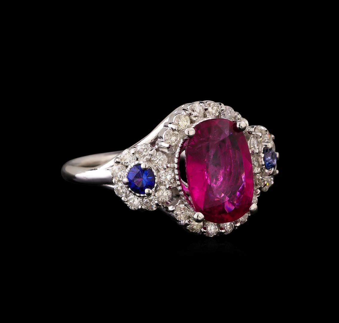 One electronically tested 14KT white gold ladies combination cast & assembled tourmaline, sapphire & diamond Ring with a half round shank with a bright polish finish. Identified with markings of "14K". Condition is new. Containing: One prong set oval modified brilliant cut natural pink tourmaline, measuring 11.20 x 7.91 x 4.60mm, approximate weight of 2.62ct., clarity is moderately included, type II, medium, moderately strong, purple red color, (GIA PR 5/4), cut is good. Two prong set round modified brilliant cut natural blue sapphires, measuring 3.20 - 3.20 x 2.08 mm, approximate total weight of 0.34ct., clarity is slightly included, type II, medium dark, moderately strong, blue color, (GIA B 6/4), cut is good. Thirty prong set round brilliant cut diamonds, measuring 1.50 - 1.50 x 0.90mm (depth est.) approximate total weight of 30 Stones = 0.37ct. Clarity: I-1. Color: I - J, Cut is Good. All diamonds and colored gemstones are graded in the mounting, unless otherwise stated. Colored gemstones are presumed to have been subjected to commonly used enhancement processes. Total Weight of Colored Stones 2.96ct. Total Weight of Diamonds 0.37ct. Total Weight of Ring 6.40 grams. GGL Appraised at $3,810.00.